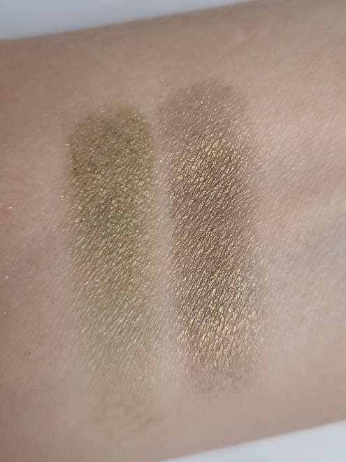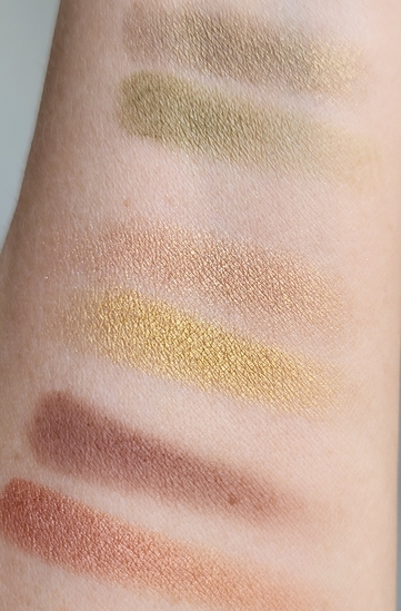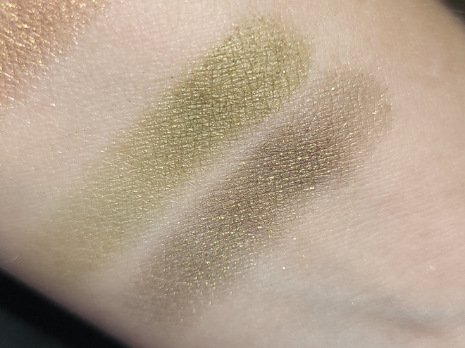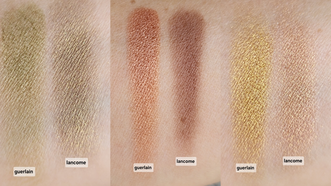 Добавлю сюда сравнительные свотчи с новогодней палеткой Lancome по трём оттенками — зелёный, коричневый, золотой: