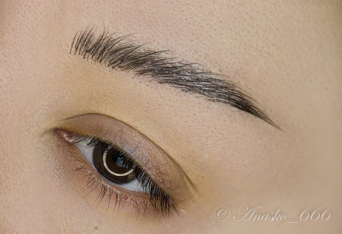 Рисую волоски там, где мне их нехватает, ближе к кончику брови проходусь по одному месту несколько раз для затемнения: