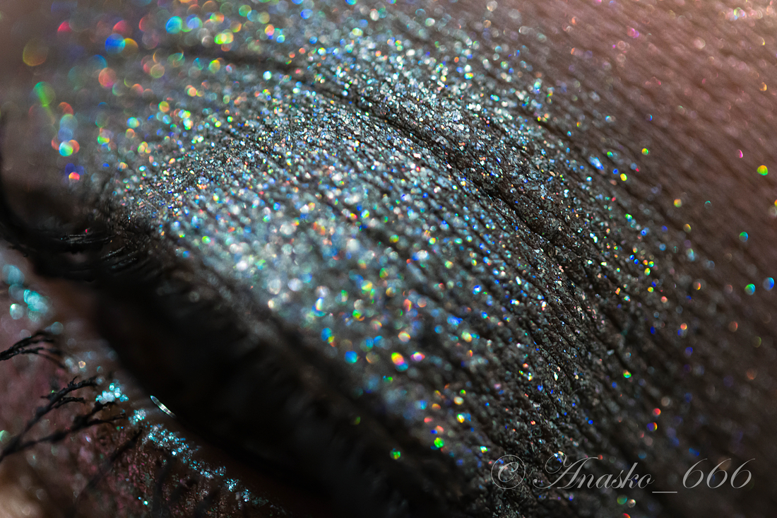 Тени мелкого помола, при нанесении не осыпаются. Тени из этой линейки единственные, что я наношу без использования липких подложек как бы втирая в кожу. В зависимости от оттенка голография проявляется у кого-то ярче, а кого-то совсем приглушенно-сдержанно.