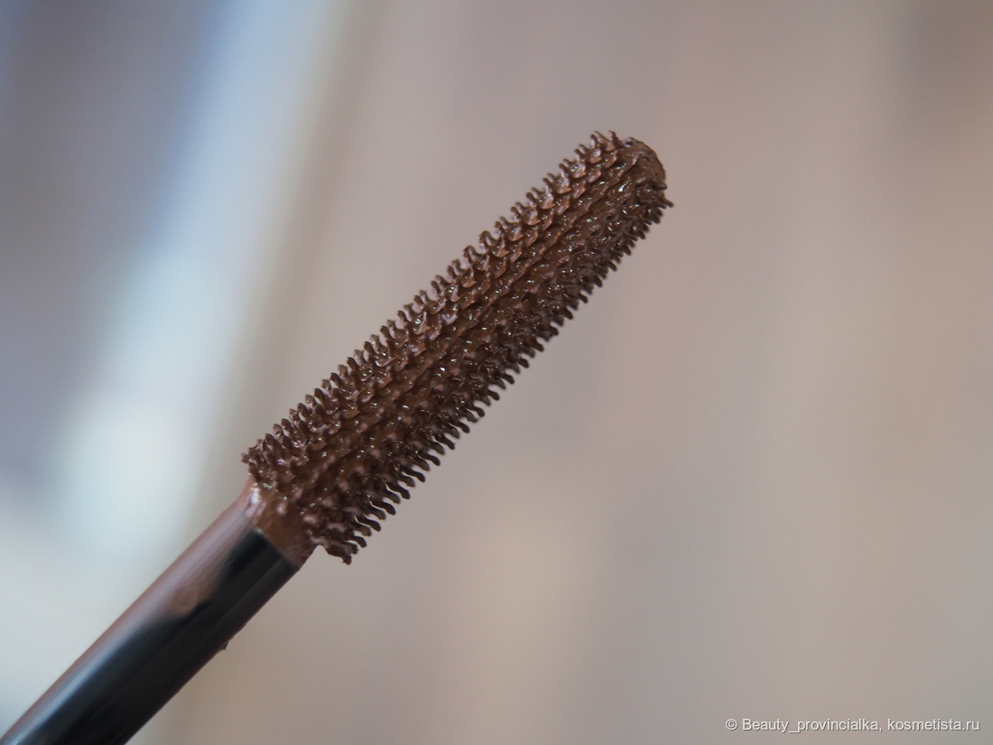Оттенок продукта на щёточке — отчетливо коричневый, эдакий молочный шоколад. На ресницах я его не разглядела — смотрится просто чуть деликатнее чёрного. Но именно такого эффекта я и ожидала. Скорее всего, попади я на солнышко — поймала бы отчётливее.