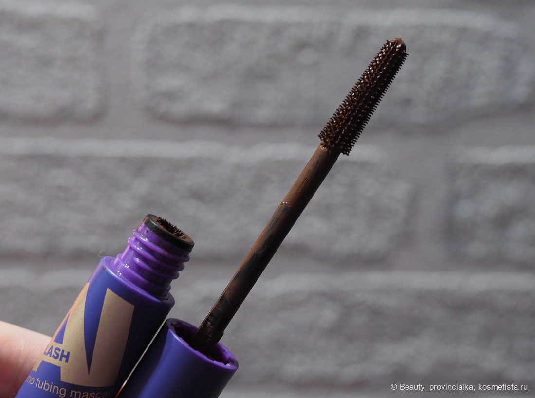 Внутри тубы нас ждёт силиконовая щёточка чуть расширяющаяся к основанию. На ней много коротких щетинок. Удобная: легко было прокрашивать внутренний уголок и подхватывать ресницы у ресничного края — ни разу его не заляпала, хотя опасения были.