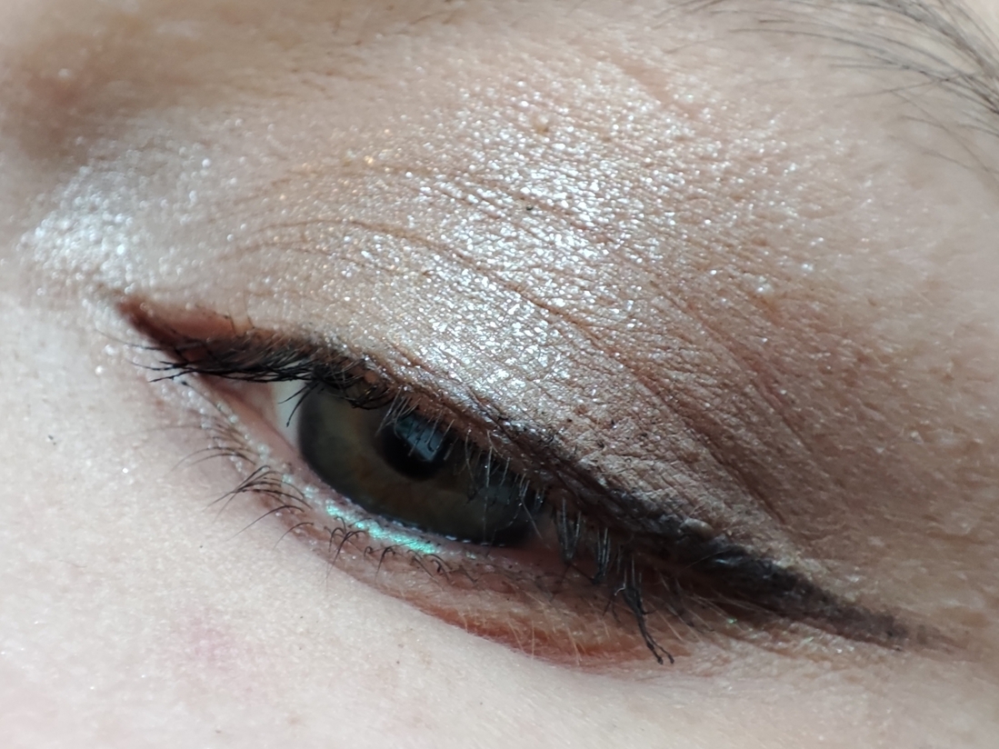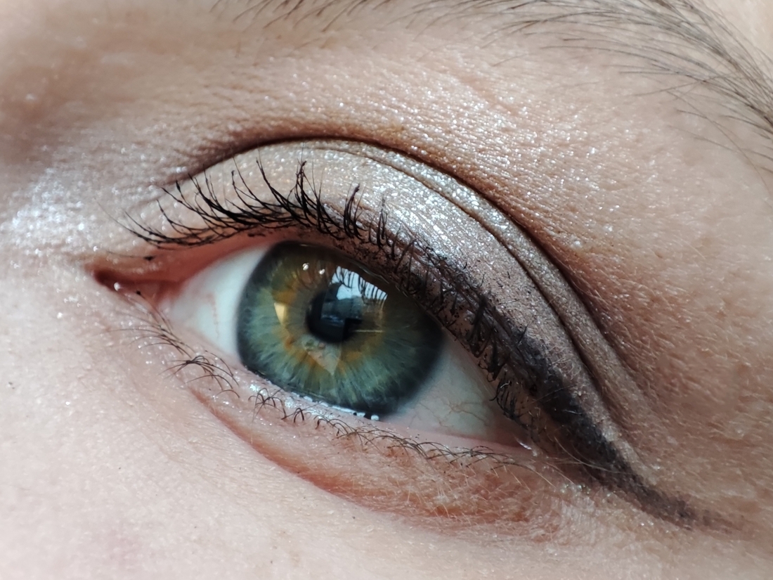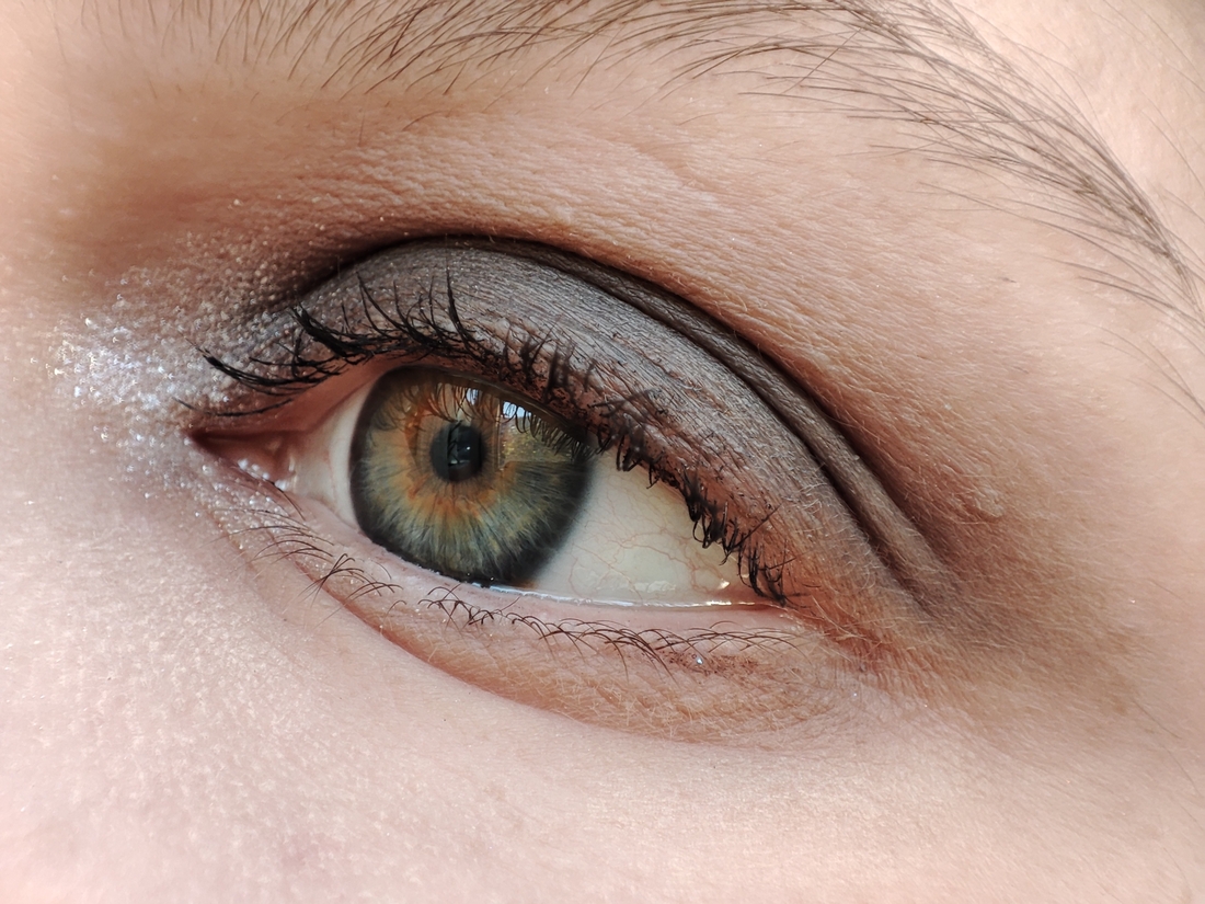 #3 Теперь уже на базе. Коричневый по нижнему веку, в складке века и на внешнем уголке. Серебро по всему подвижному веку, шампанское во внутренний уголок. Стрелка из серого. На слизистой дуохромный карандаш от essence. Тут уже ничего не скаталось.