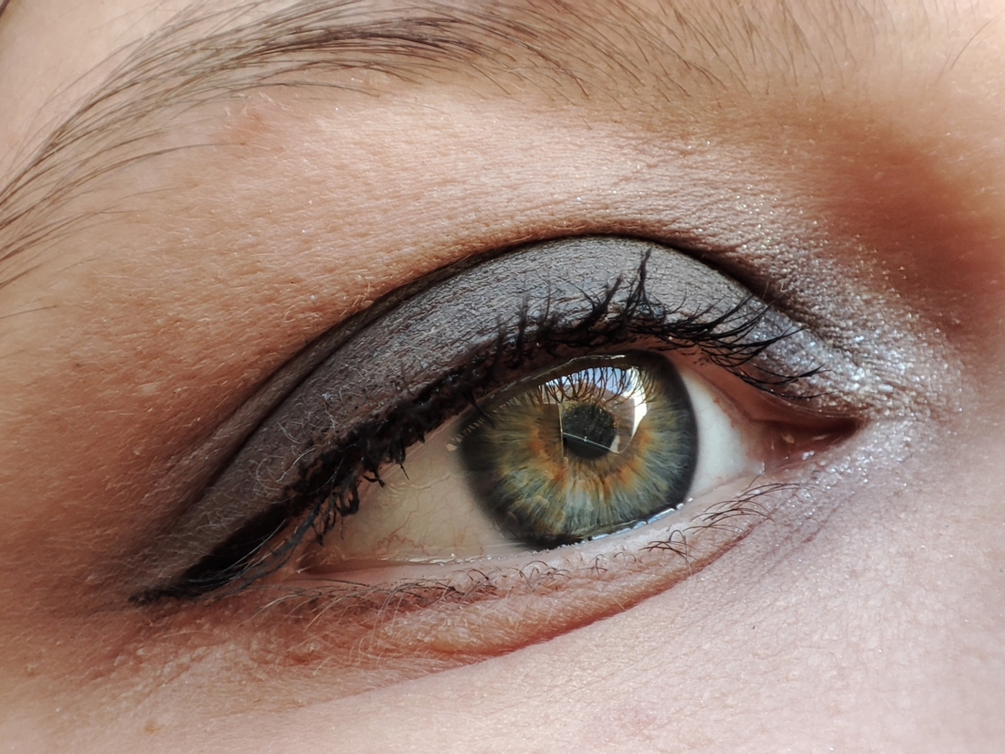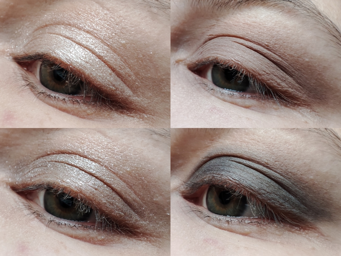 Первый. Он же серый. Он же хороший средний серый. Матовый. Им можно затемнять уголок и делать выразительные смоки (у нас же смоки твид палетка, помните?).