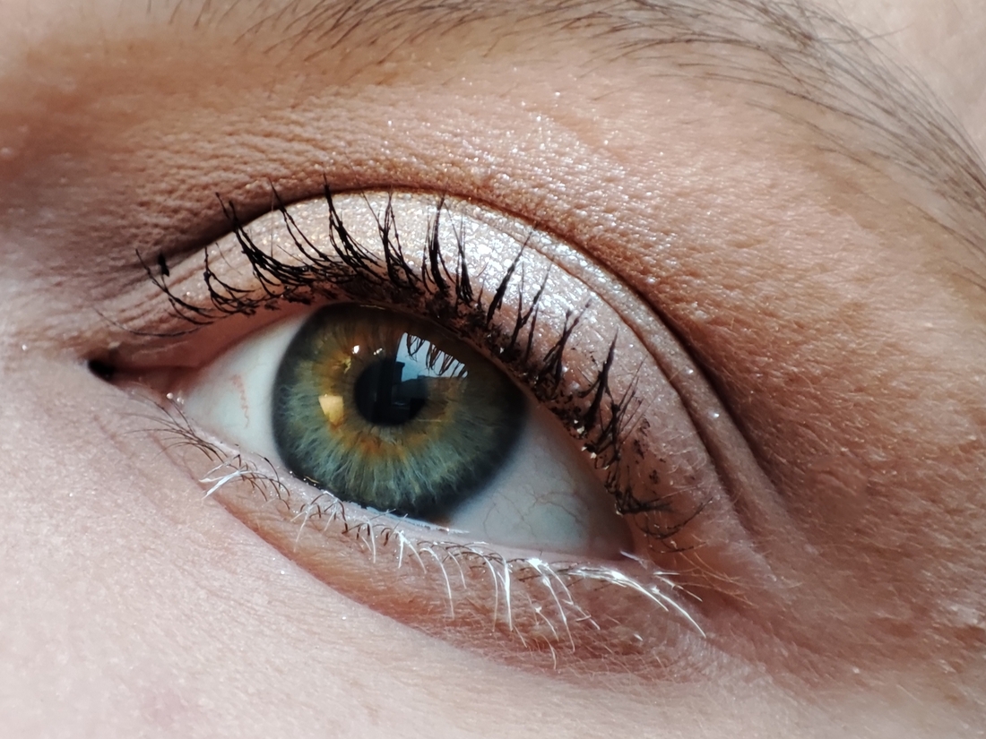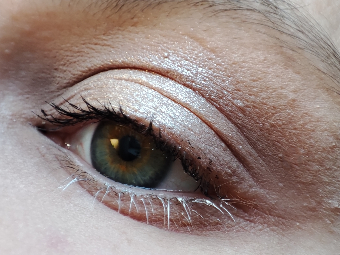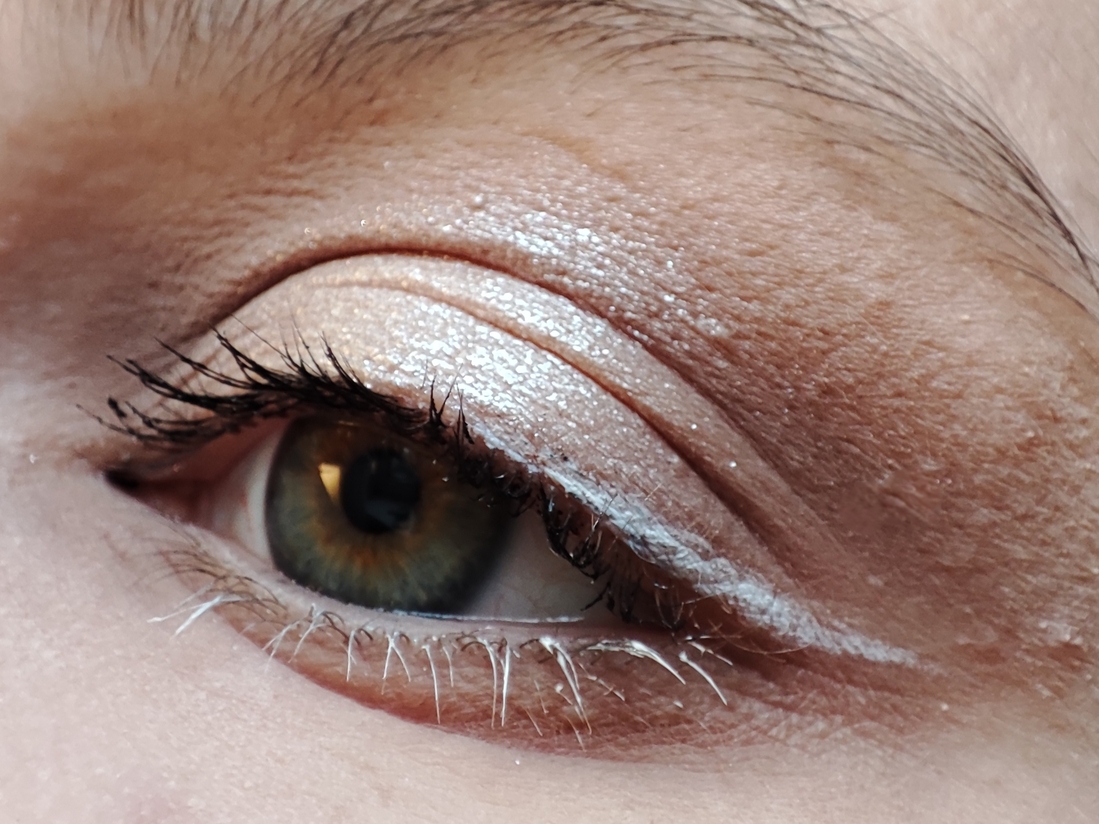 #4 Коричневый во внутреннем и внешнем уголке, в складке и чуть-чуть по нижнему веку. На подвижном шампанское. На нижних ресничках белая тушь от Rad.