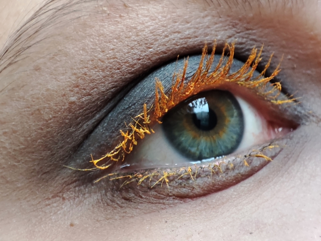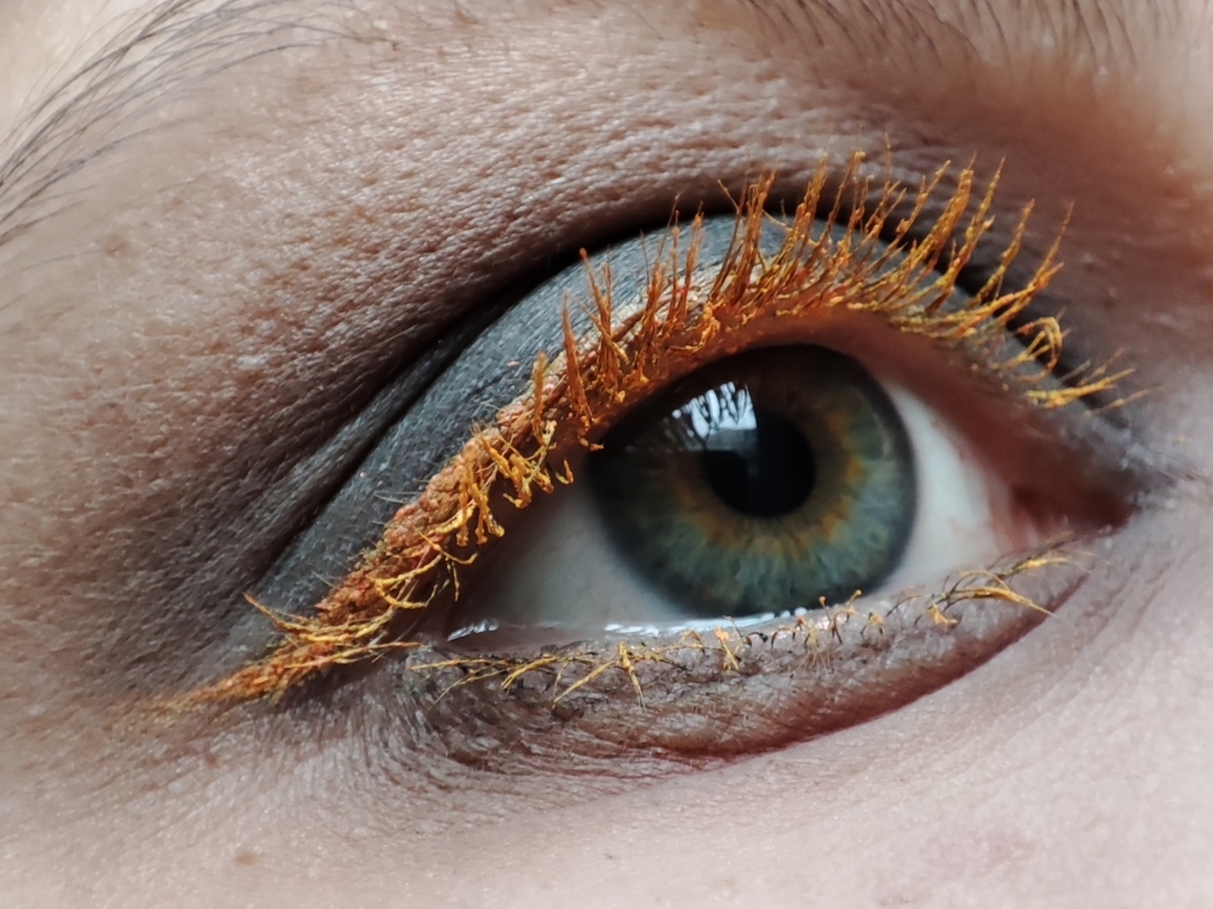 #5 Немного осени. Серый нанесен по всему верхнему веку и немного по нижнему, коричневым оттушеван в кожу. На ресницах красная и жёлтая туши от Belor Design.