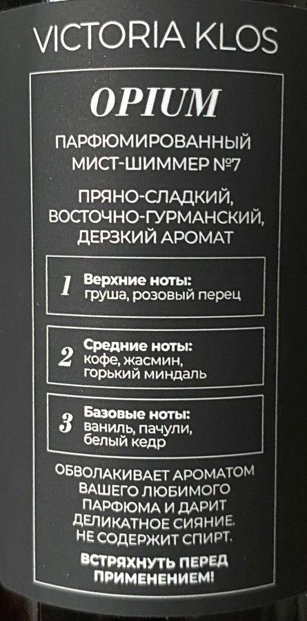 Кожу не сушит и не стягивает, блеск практически не заметен (на волосах особенно, если, конечно, не поливаться очень активно). Так что, если вам нужно сияние, то присмотритесь к предыдущему средству. А вот аромат этот спрей оставляет ощутимый. Не скажу, что один в один Opium, но ноты действительно узнаваемы. Первые минут 5-7 аромат играется, раскрываясь по-разному, а потом на моей коже это кедр с пачули, лёгкой остринкой розового перца, а на заднем плане отдаленно легчайший несладкий ванильный раф. И этот аромат также ощущается на коже не менее 8 часов, а на волосах можно уловить и на второй день.