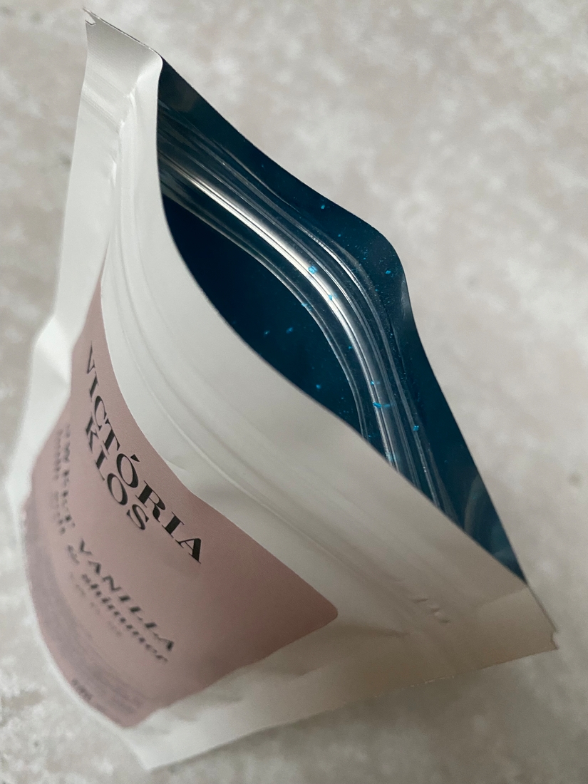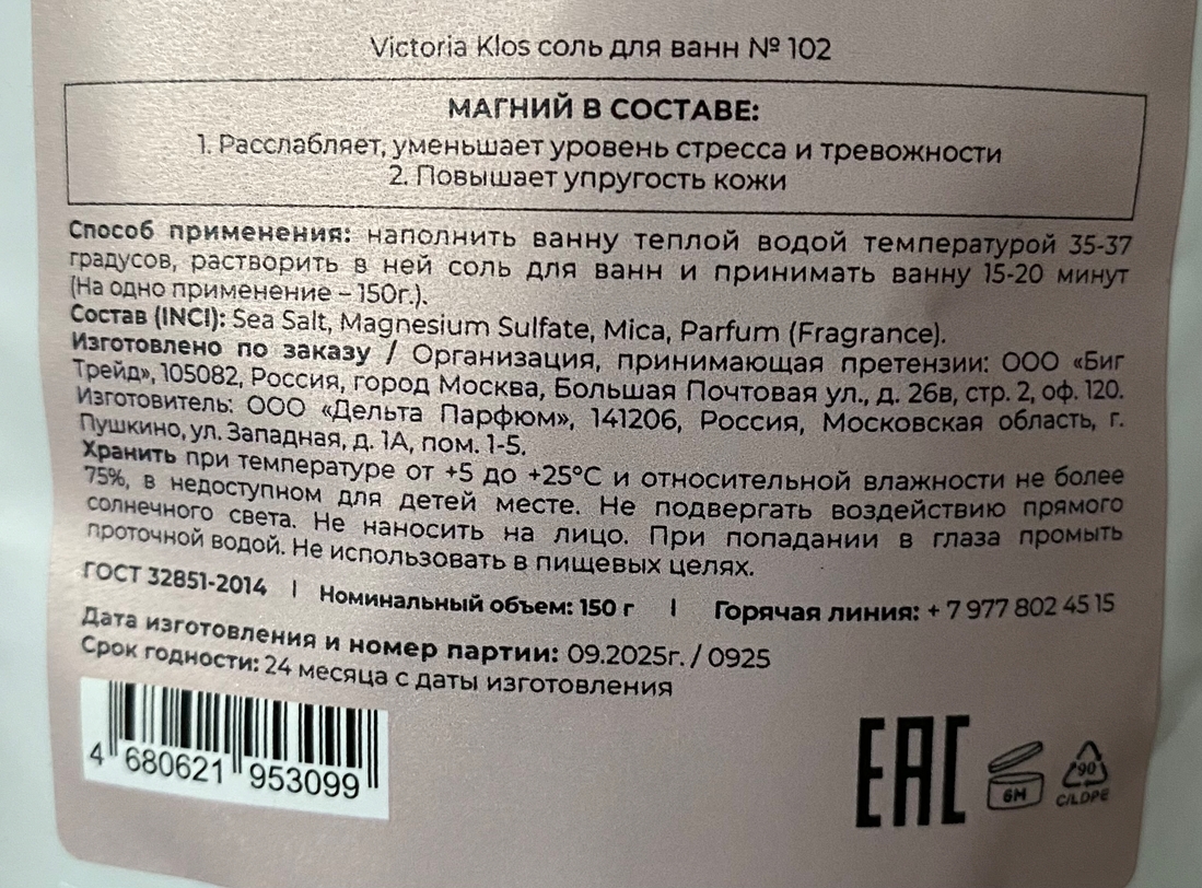 Начать хочу с парфюмированной соли для ванны. Соль продаётся в НЕпрозрачном пакете с удобной застёжкой Zip-lock, за что отдельное спасибо производителю за это. Такой формат практичен: соль удобно хранить, она не впитывает лишнюю влагу и не рассыпается, даже если случайно уронить пакет.