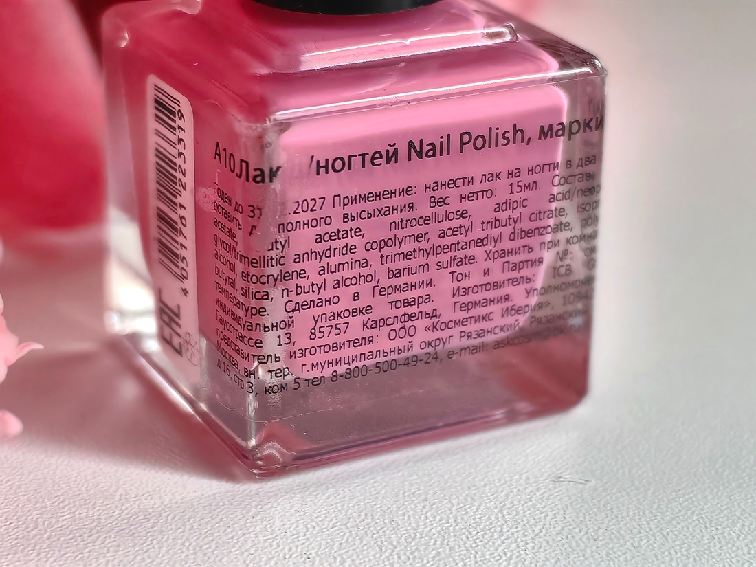 Упаковка лака — красивый прозрачный стеклянный куб. На нем есть название бренда и наклейка с информацией о продукте. На крышке — название и номер оттенка, срок годности после вскрытия.