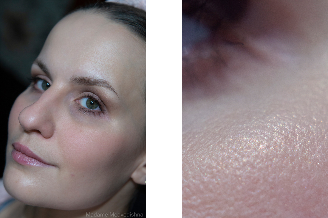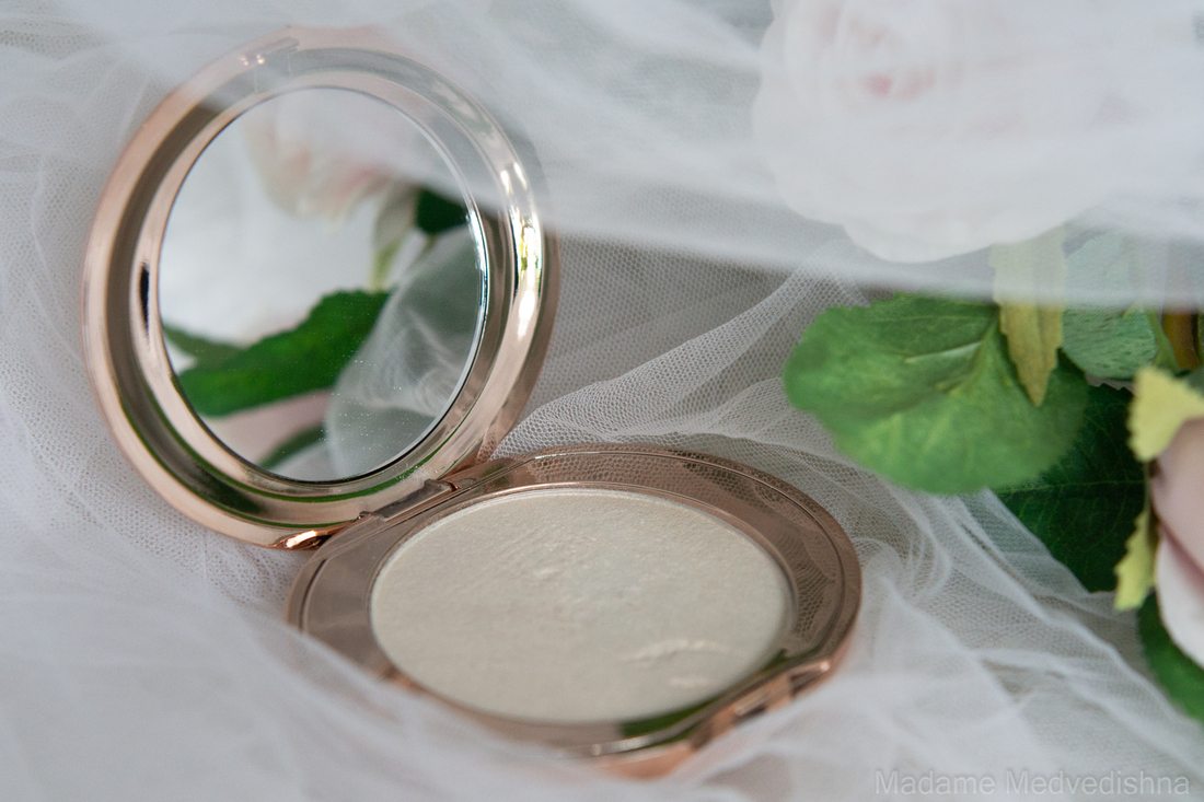 Что сказано на официальном сайте про хайлайтер: невероятно тонкий помол, ложащийся сияющим покрытием, жемчужно-розовый оттенок, освежающий лицо.