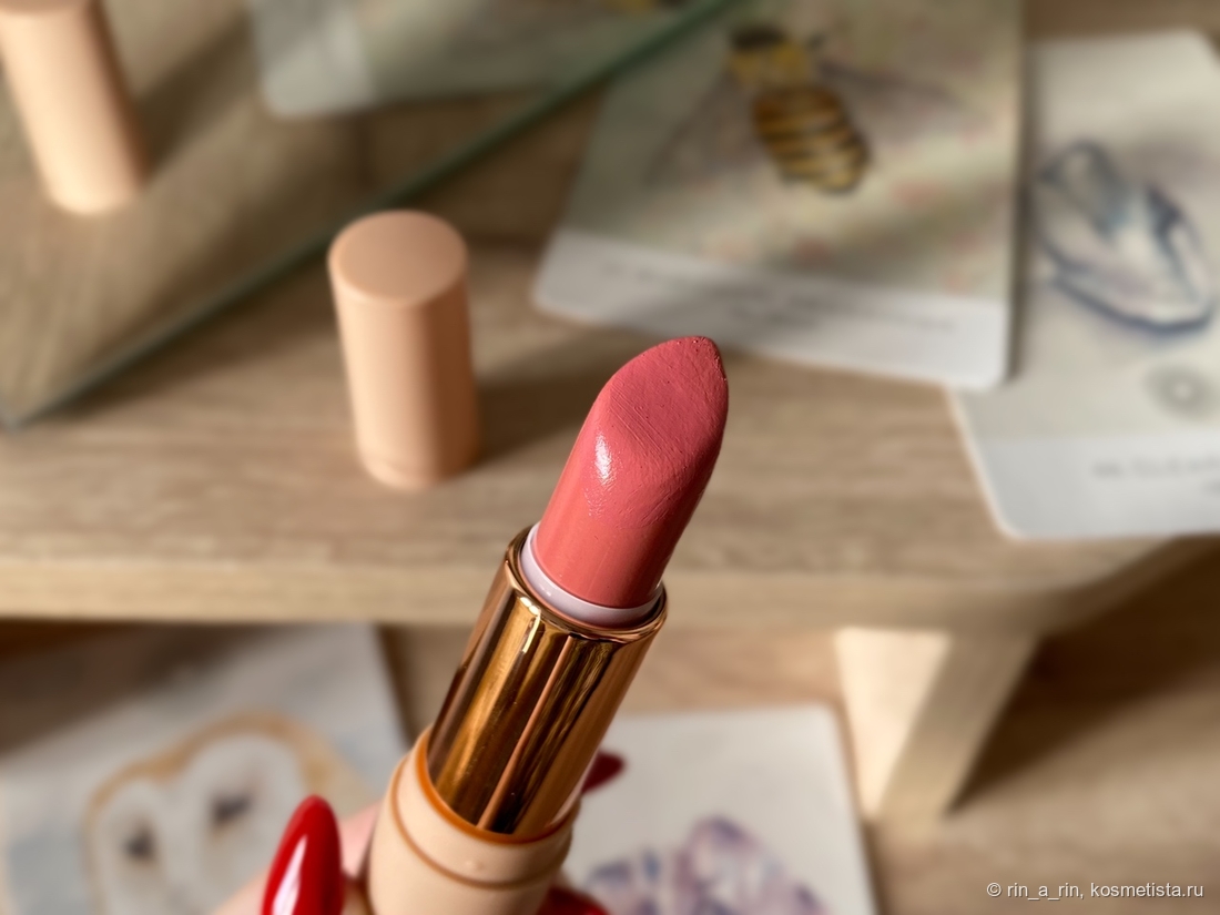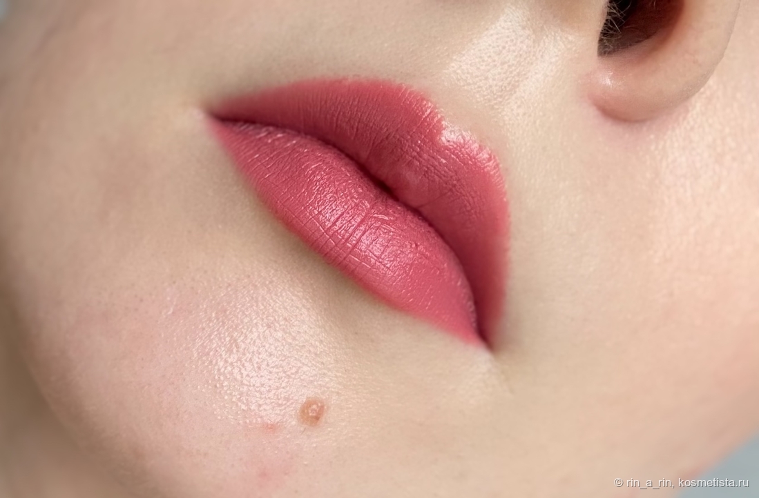 Финиш у помады при свежем нанесении умеренно глянцевый, через минут 20-30 носки становится сатиновым. Помада заявлена как увлажняющая, но какого-то супер-вау ухода от нее за губами я не заметила.