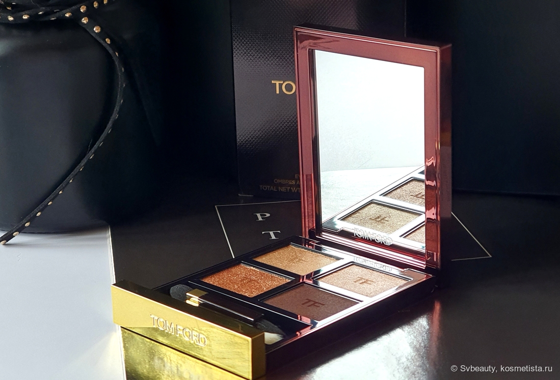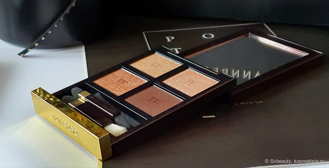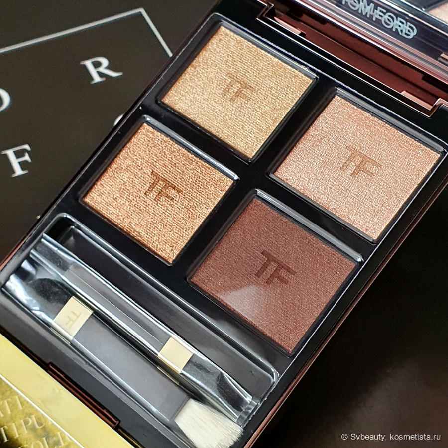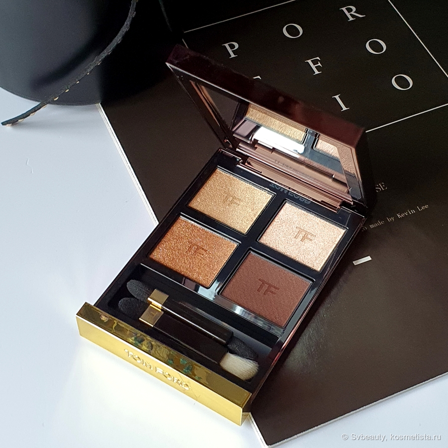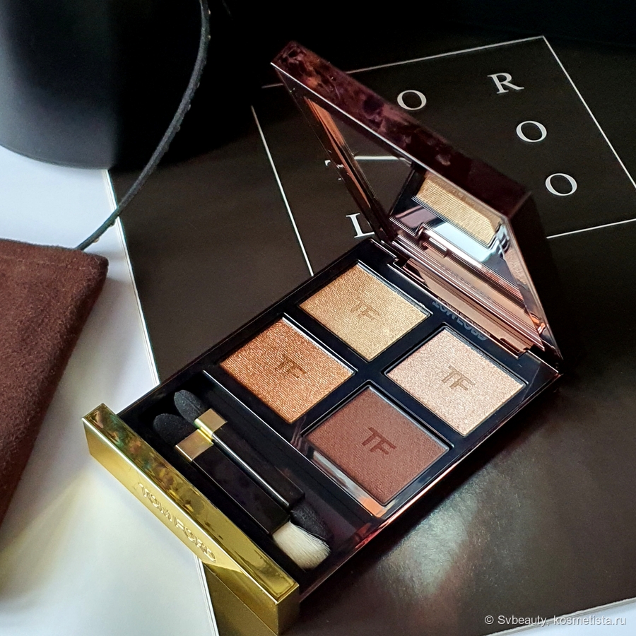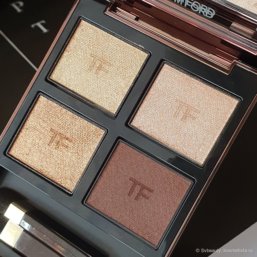 Еще одна удачная, на мой взгляд, новинка 2025 года в мире декоративной косметики — это палетка теней для век в кремово-пудровой формуле Tom Ford Eye Color Quad Crème в оттенке 48 Peach Glamour.