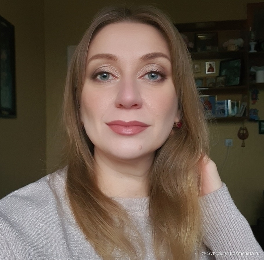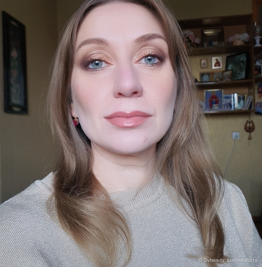 Он поплотнее, чем два верхних оттенка. Цвет насыщенный, но легко тушуется в дымку. Однако при плотном нанесении он все-таки немного жует возрастное подвижное веко. Не критично, конечно, и в общем образе не видно, но все же я предпочитаю наносить этот оттенок тонко или растушевывать в дымку.