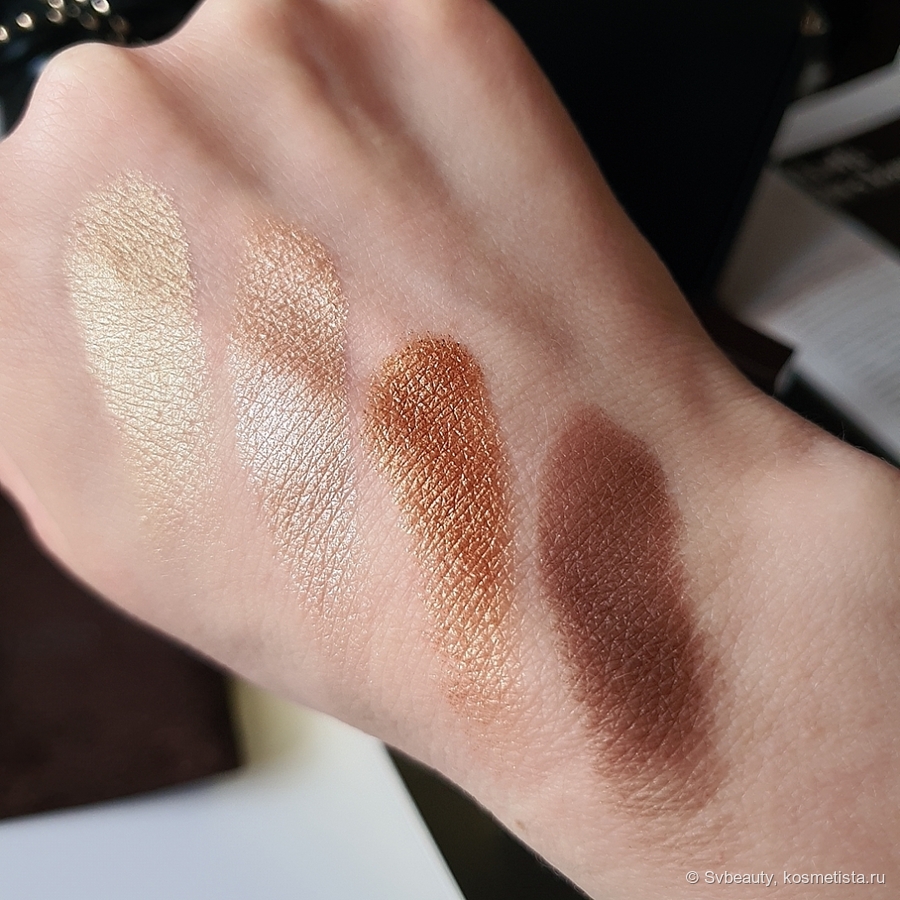 Тени в палетки имеют уже знакомую кремово-пудровую формулу, которая отлично подходит для зрелой и сухой кожи век.