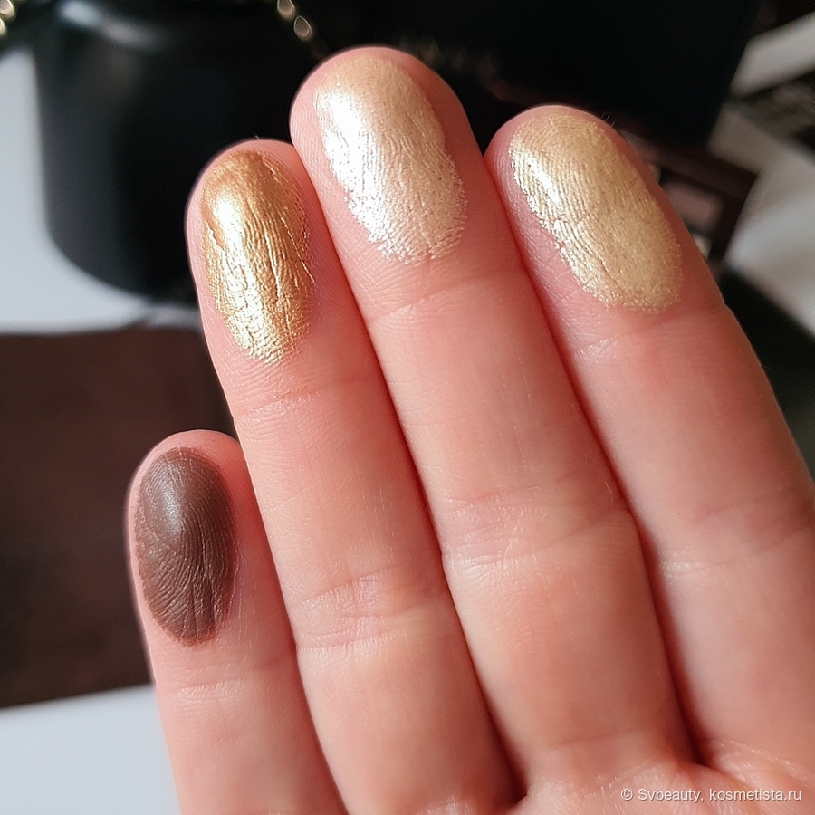 Они обладают насыщенной пигментацией и ярким, скорее влажным сиянием. Легкая текстура этих теней не забивается в складки века и не создает эффекта «пожеванного» века. Разница между оттенками заключается только в цвете: слева — золотой, справа — розовый.
