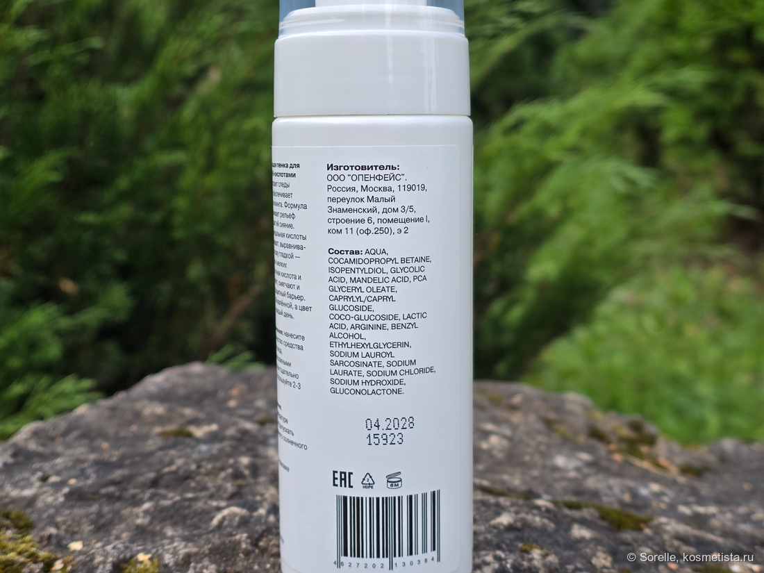Состав тут лаконичный: мягкие ПАВы, кислоты (AHA и PHA: гликолевая, миндальная, молочная и глюконолактон) + аминокислота аргинин.