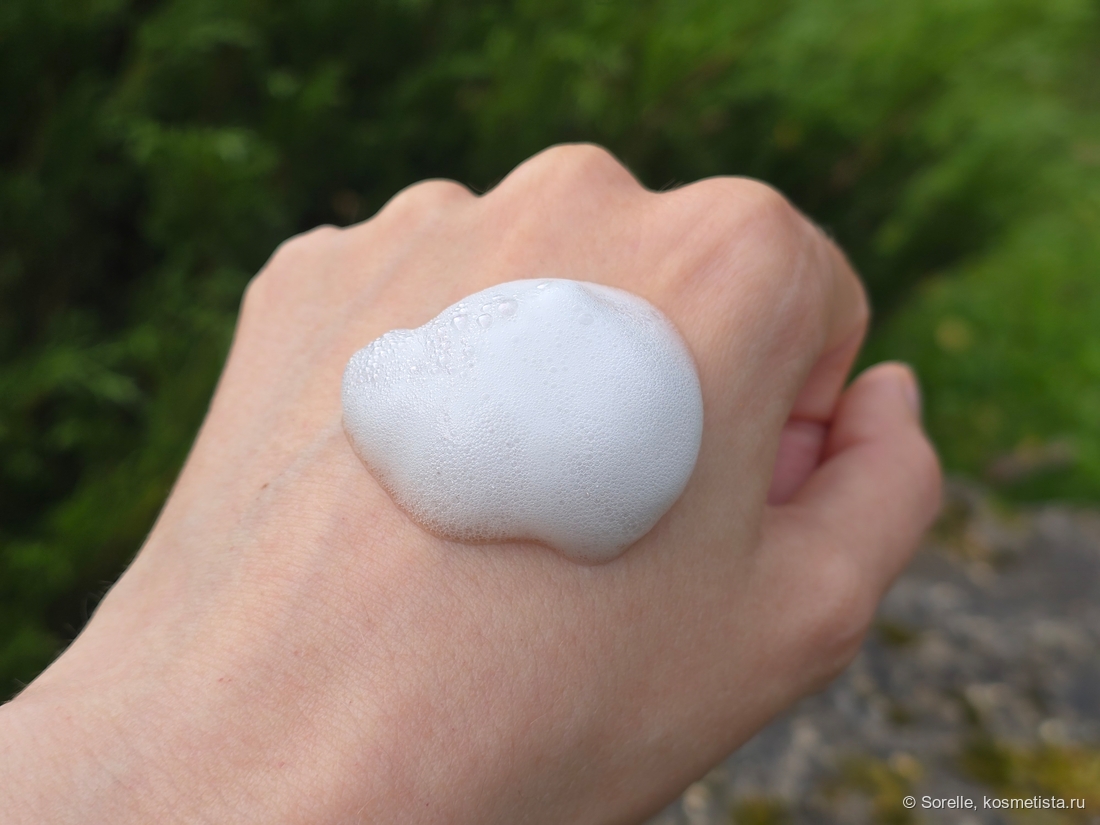 Дозатор сразу выдаёт пенку — она классная, воздушная, пышная, времени на умывание хватает.