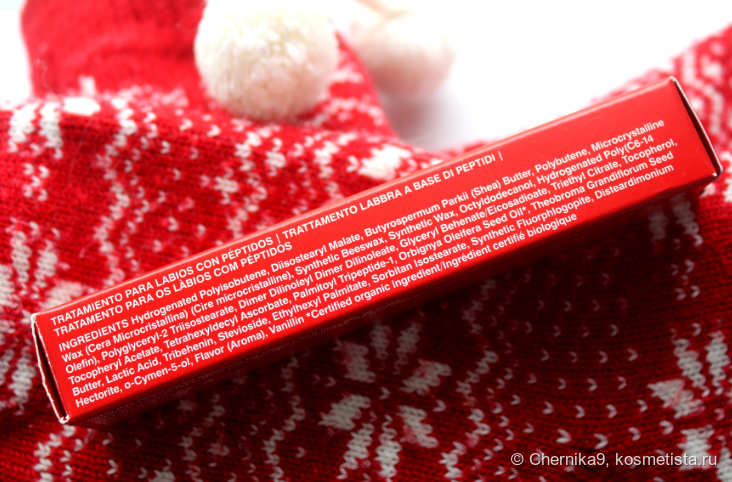 Блеск обещает прозрачное глянцевое покрытие с ароматом клубничной глазури, омолаживание губ и пептиды. Он вышел в обновлённой формуле и его состав сейчас дорабатывается. Производитель уверяет, что скоро в нём появится масло ши и другие компоненты. Сейчас состав включает следующие вещества.