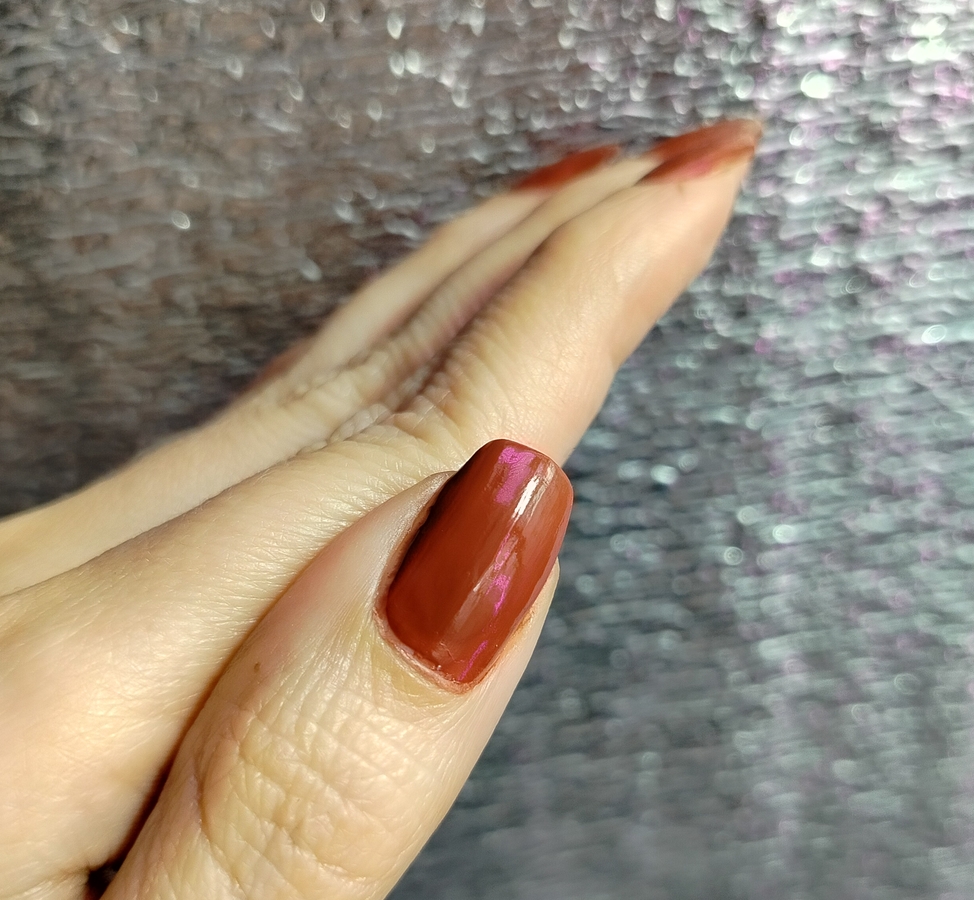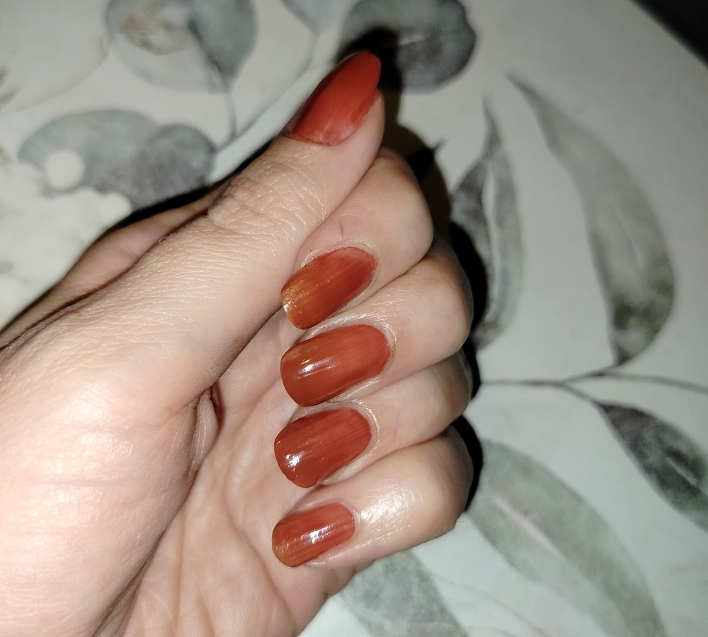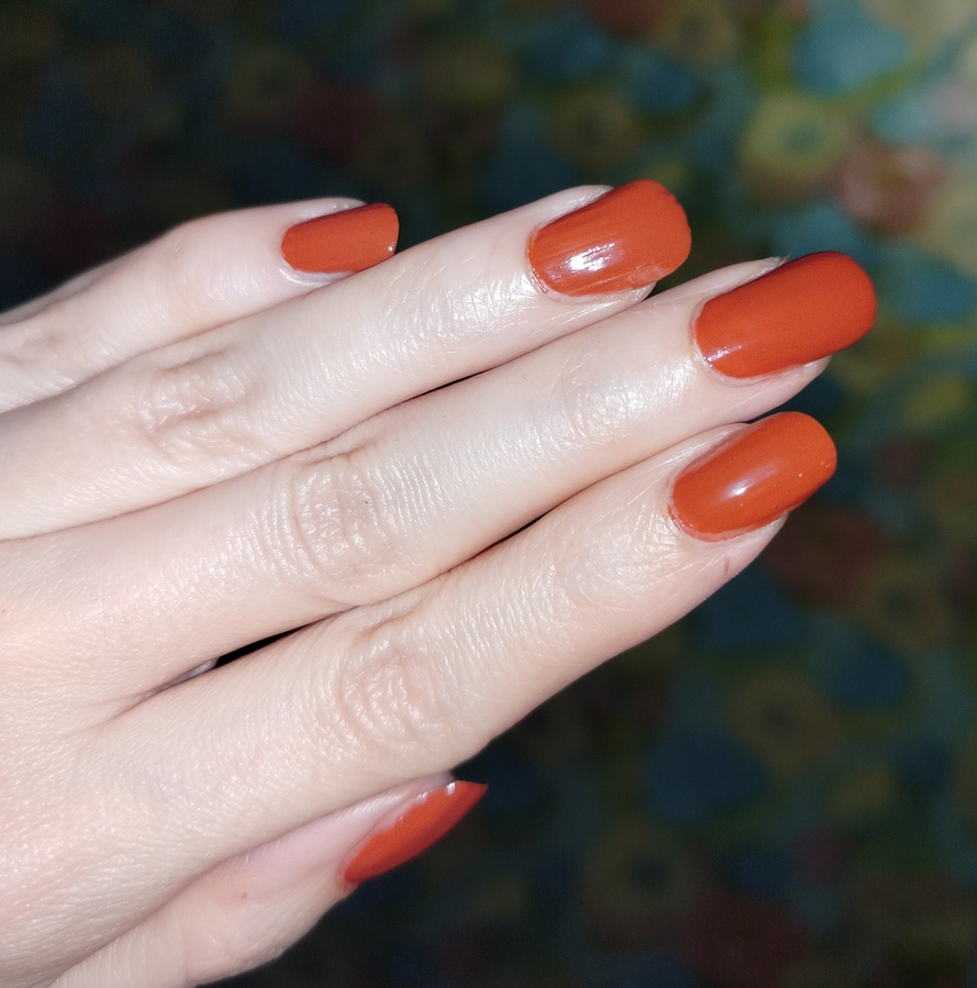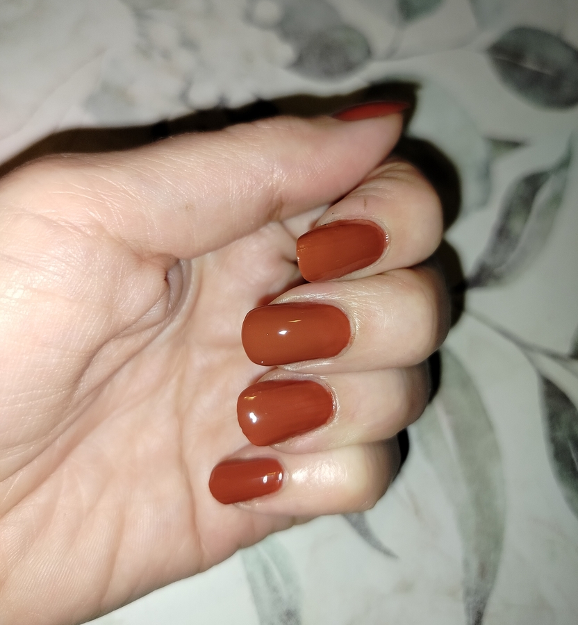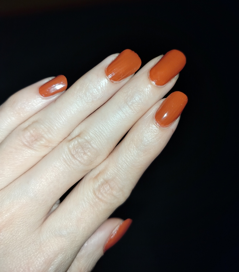 Я просто влюбилась в этот «ржавый» оттенок, хотя имею в коллекции несколько похожих. Пока хочется носить только его.