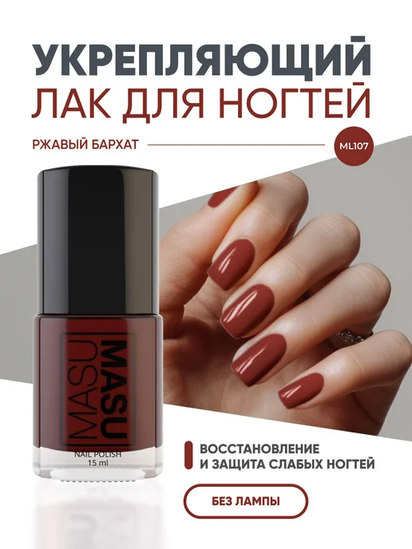 Обожаю нюдовые покрытия — они актуальны в любой ситауции, при этом позволяют выглядит ногтям красивыми и аккуратными. Одно время пользовалась только ими — душа совершенно не лежала к цветным, блестящим покрытиям. Предлагаю вашему вниманию красивый и очень осенний, на мой взгляд, оттенок отMasu Masu ML 107 #Ржавый Бархат.