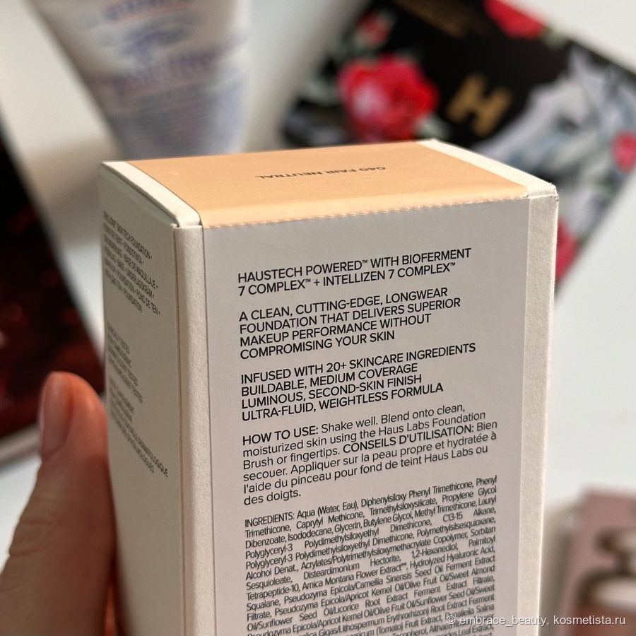 Это именно тот тон, который я искалагодами. Я не поверила своему счастью, когда, во первых, наконец-то додумалась подойти к стенду Haus Labs и поискать нужный мне оттенок (коих там 51 и каждый найдет свой, а таким бледнолицым как я — это жизненно необходимо), во вторых — когда решилась его купить и в итоге нанести на лицо.