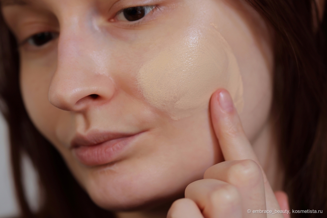 Перед покупкой важно помнить, что тон имеет среднее покрытие и довольно жидкий (если нужен аналог этой жидкости, то это Estee Louder Double Wear Water Fresh) поэтому наносить из помпы прям на лицо — неудобно, все течет мимо, а вот с руки или с палетки — самое оно, набирая бьюти-блендером или кистью.