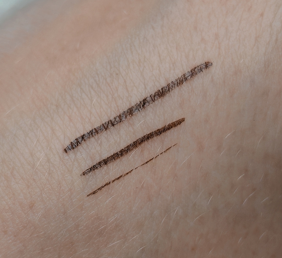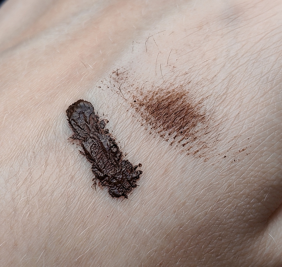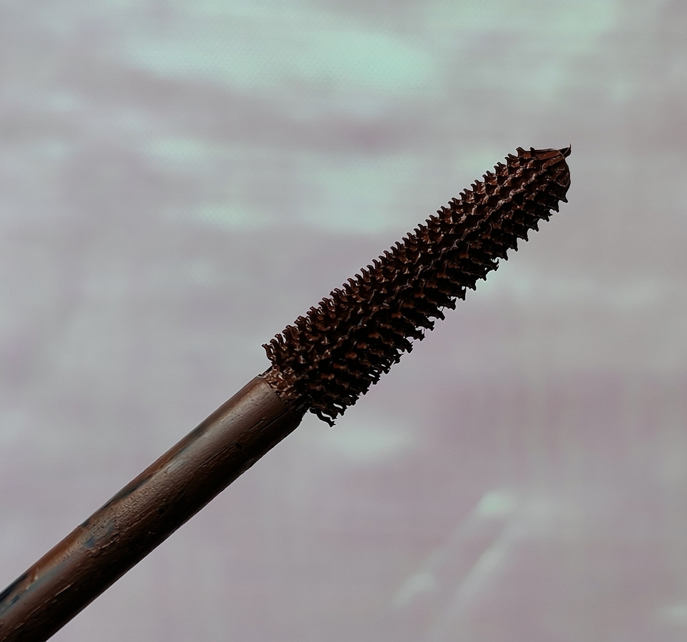 Оттенок темно-коричневый. На ресницах выглядит мягче, чем чёрная тушь. Сам оттенок виден при дневном или ярком освещении.