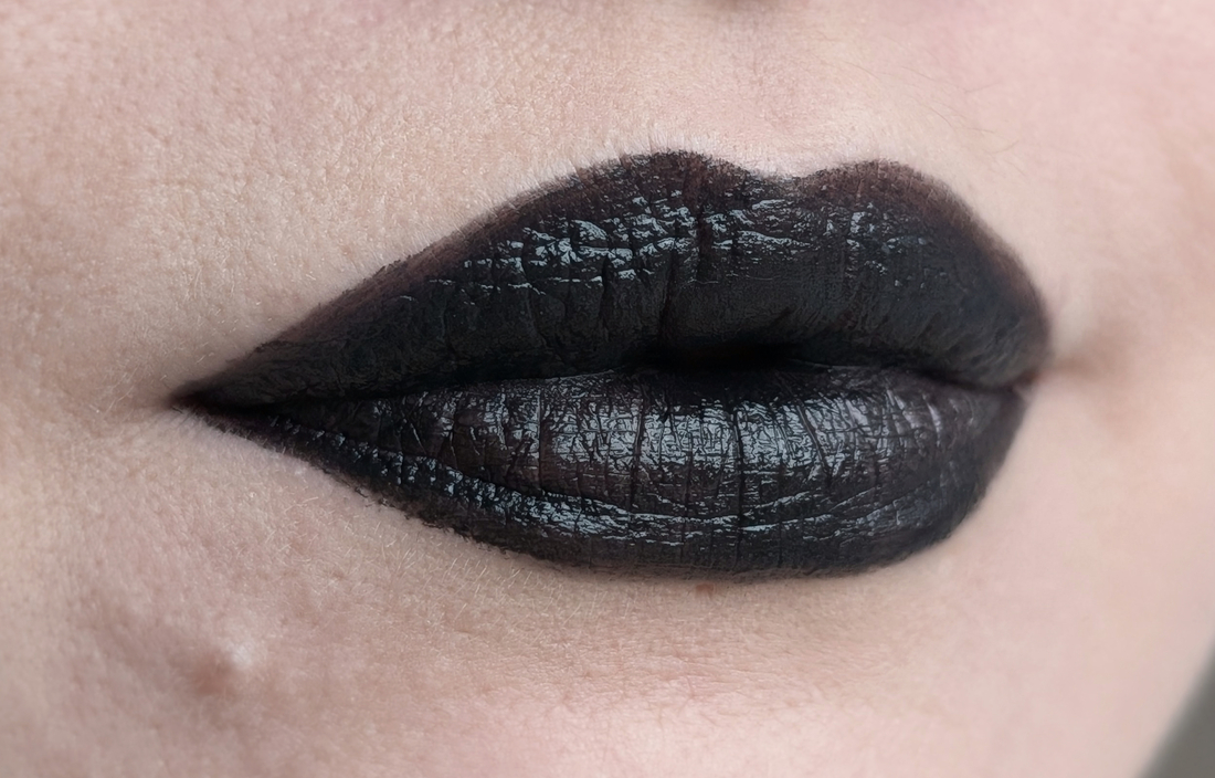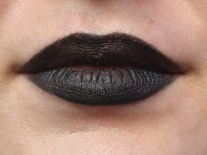 Меня удивила такая формула в чёрной помаде, особенно учитывая, что она заявлена как матовая. На мой взгляд, подобная текстура более свойственна для нюдов, возможно интенсивных, но повседневных оттенков — которые про комфорт, а не эффектность. От такого тёмного цвета я скорее скорее ожидала суховатой, возможно даже пластилиновой плотной тягучей текстуры. Тяжело наносимой, зато ультранасыщенной и несдвигаемой, что предотвращает размазывания, плеши, и позволяет наносить помаду в один слой. Такими были почти все мои тёмные и мрачные подруги, наверное потому я ожидала подобного.