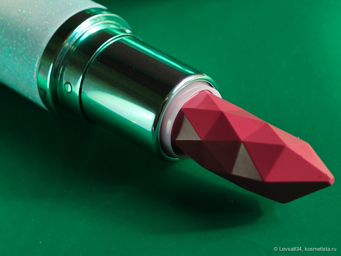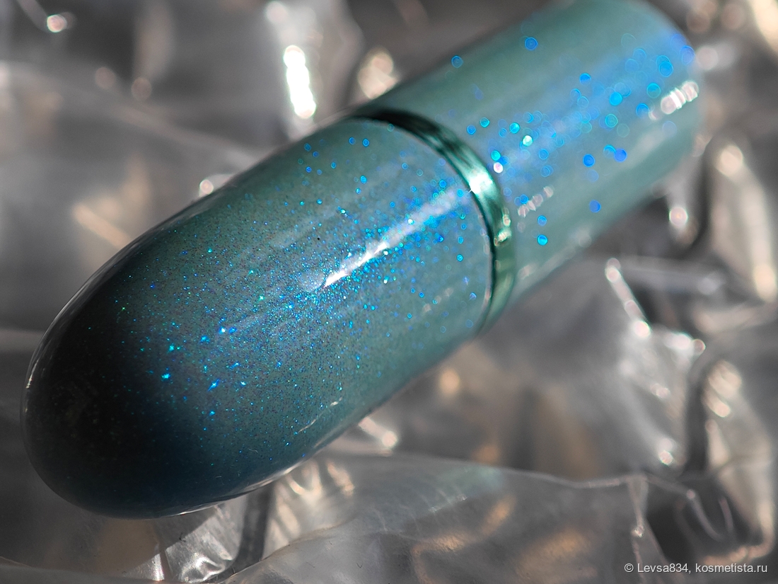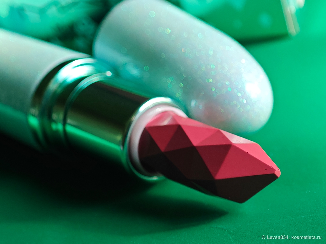 Во-первых, я невозможно сильно люблю сочетание синего или голубого с зелёным. Во-вторых, обожаю помады бренда в сатиновой формуле. В-третьих, у этой красотки не только костюм новогодний, но и стик в уникальной форме. Ну, и в-четвёртых, оттенок тоже понравился.