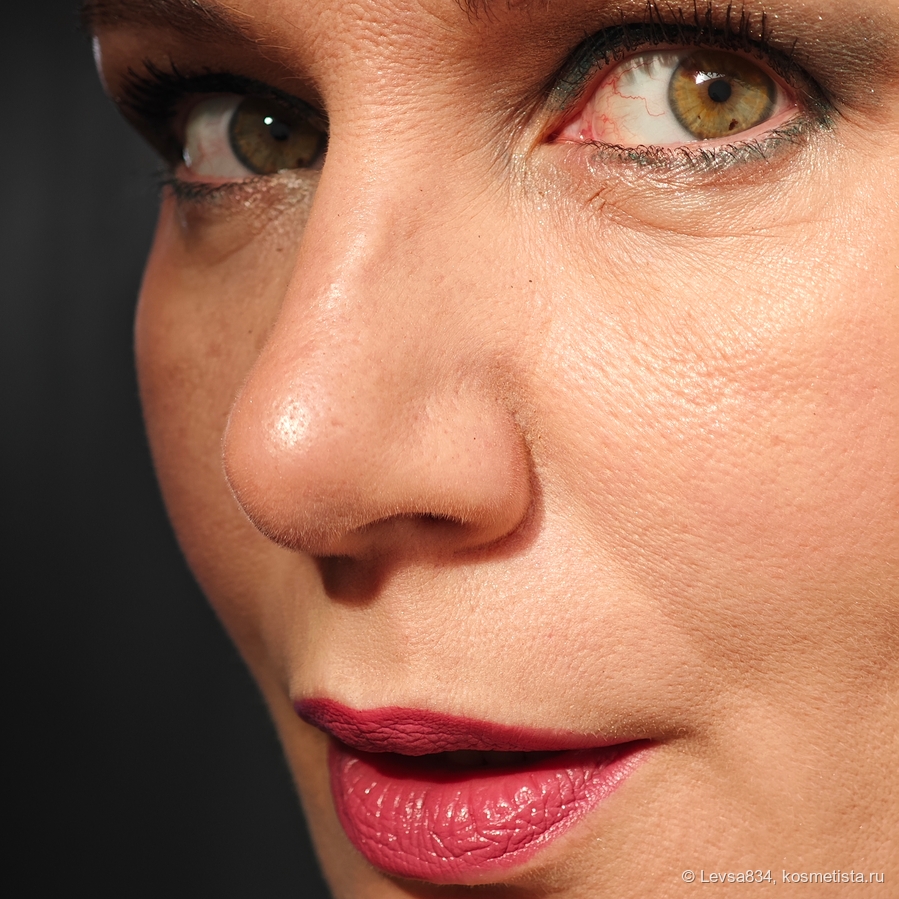 Можно носить эту помаду и с контурным карандашом, и без него, наслаивать или наносить очень тонко. Сухие участки кожи помада не акцентирует, но и не прячет. Заметно это лишь на макро. Рельеф визуально разглаживает.