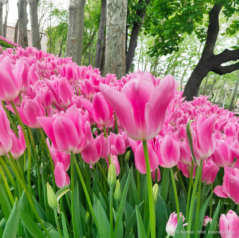 Сначала это монотюльпан. Прекрасный розовый, с лепестками с белыми и более насыщенными розовыми прожилками. Такие я в стамбульском парке Гюльхане застала всего лишь пару раз, потому что всегда, увы, приезжаю позже традиционного фестиваля. А эти цветут дольше всех, их убирают самыми последними. На фото размер цветков кажется обычным, но по факту они 7-10 сантиметров по высоте… У них легкий пряно-пудровый аромат с деликатной фруктово-цветочной сладостью. «Залипательный», дурманный, пьянящий… В запахе этого турецкого тюльпана нет ничего, к чему привыкли мы: никакой сочно-мясистой «хрустящей» зелени, пыльцовой терпкости, щекочущей обоняние… Они просто очень-очень другие (как и сами турки… 21 год плотного общения с представителями самых разных слоев, сословий, происхождения, места рождения и жительства… не перестаю удивляться и даже офигевать…)