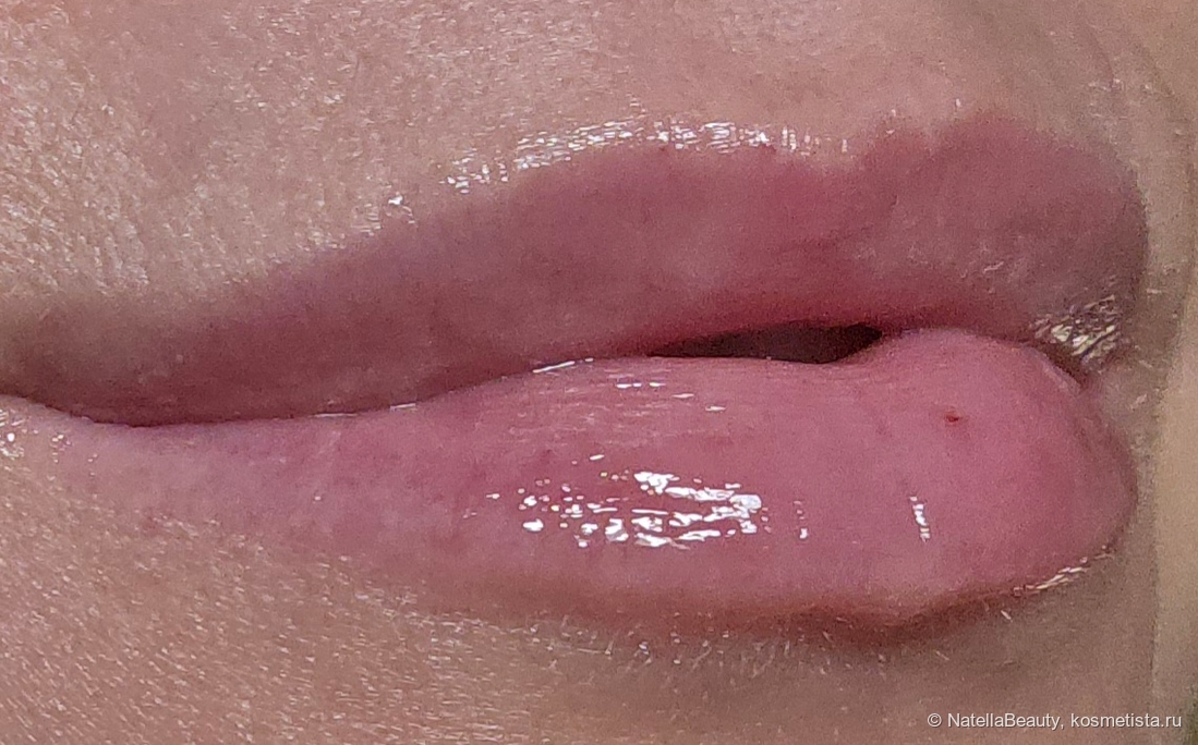 Оттенок нежный розовый, максимально близкий к тону губ. На губах выглядит очень естественно, незаметно, придаёт небольшой глянец.