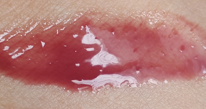 Здесь более долгий стеклянный глянец на губах, и текстура как-будто больше плотная и в то же время «скользкая» при нанесении на губы.
