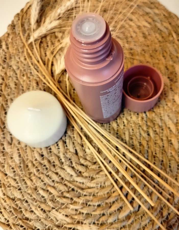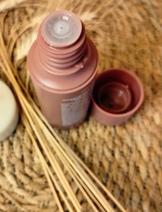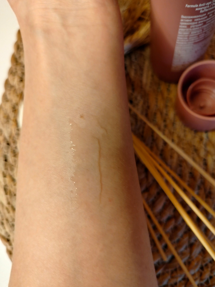 Оформление флакона исполнено в спокойном коричнево-розовом оттенке, мягкой циллиндрической формы в стиле минимализм. Дозатор вполне себе прозаичный, простое отверстие на верху бутылька. Пластик толстый, добротный. На обратной стороне полная информация от производителя. От вскрытия защищала узкая полоска скотча.