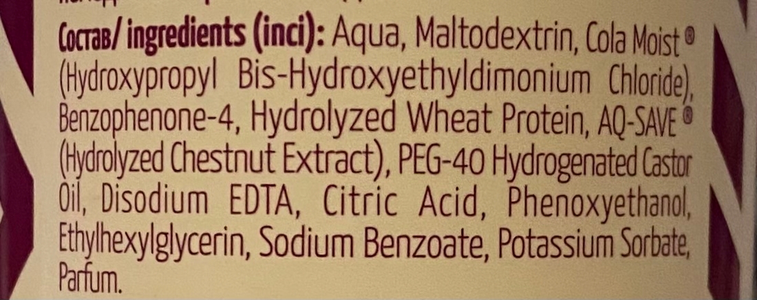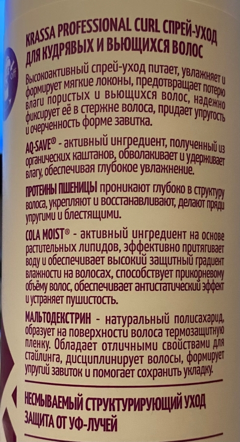 В составе этого спрея также есть протеин пшеницы и IQ-Save. А ещё есть Cola Moist — липиды, которые притягивают воду, дают прикорневой объём и антистатический эффект, мальтодекстрин — натуральный полисахарид, создающий лёгкую термозащитную и фиксирующую плёнку, которая помогает формировать устойчивый завиток. В составе тоже нет силиконов поэтому подходит для адептов КГМ.