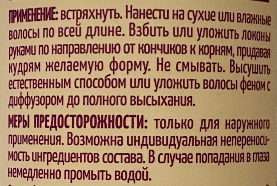 Путём экспериментов я вывела идеальный способ нанесения, при котором средство раскрывается лучше всего: помыть голову, отжать волосы, подсушить до состояния «слегка влажные, но не мокрые», сверху слегка побрызгать спреем, высушить диффузором или естественным способом. Так я получаю лёгкую фиксацию, упругий завиток и отсутствие утяжеления.