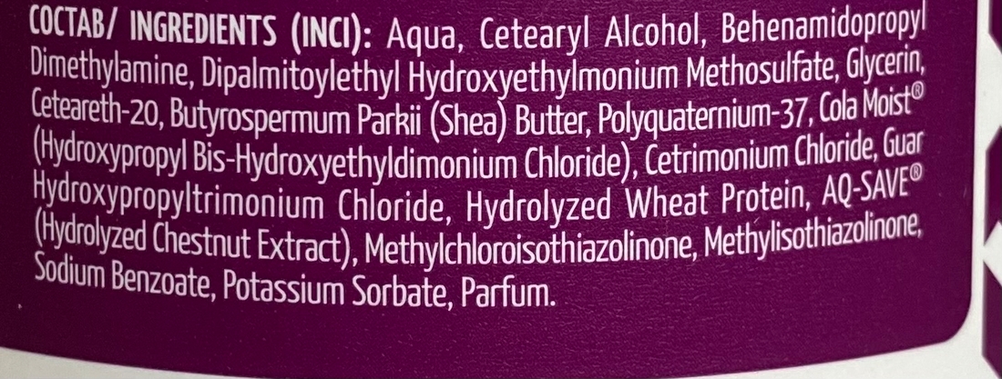 Маска полностью совместима с КГМ, в составе нет силиконов. В формуле гидролизованный протеин пшеницы, который укрепляет и восстанавливает волосы, IQ-Save их каштана, который удерживает влагу, уменьшая ломкость, и много смягчающих и увлажняющих ингредиентов.
