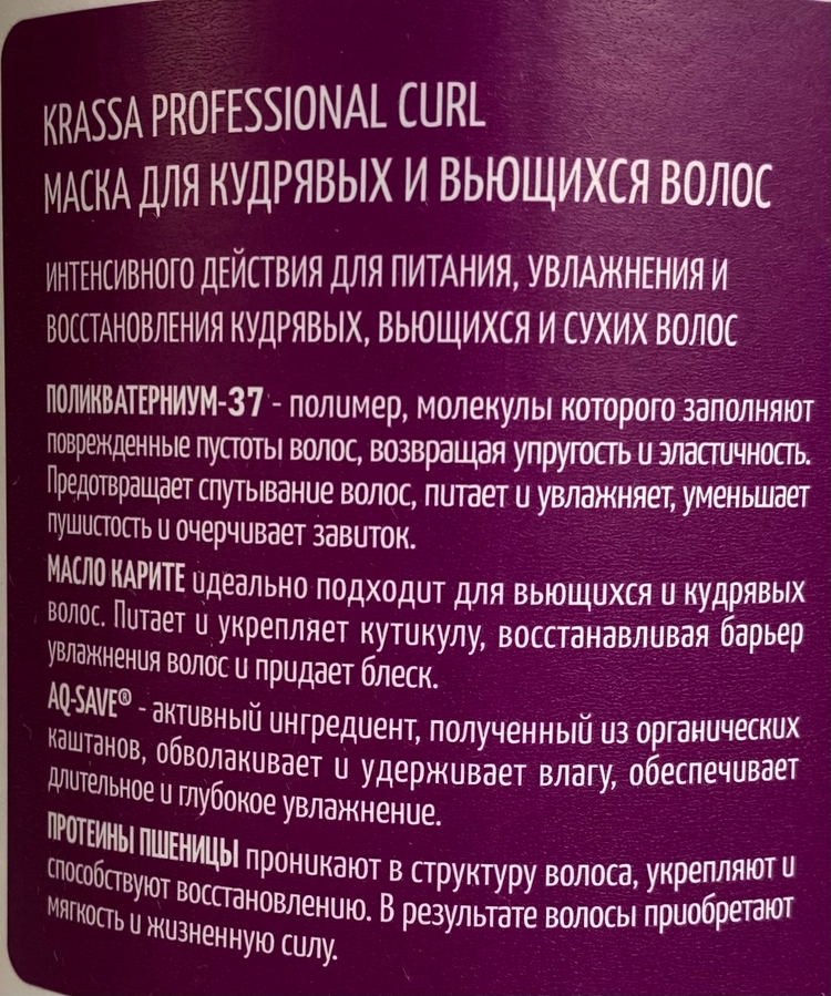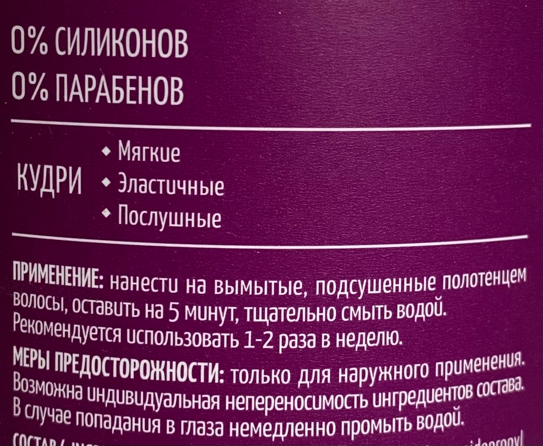 Средство обещало питать и увлажнять волосы, предотвращать потерю влаги, придавать упругость завитку, уменьшая пушистость и формируя мягкие, чёткие локоны.
