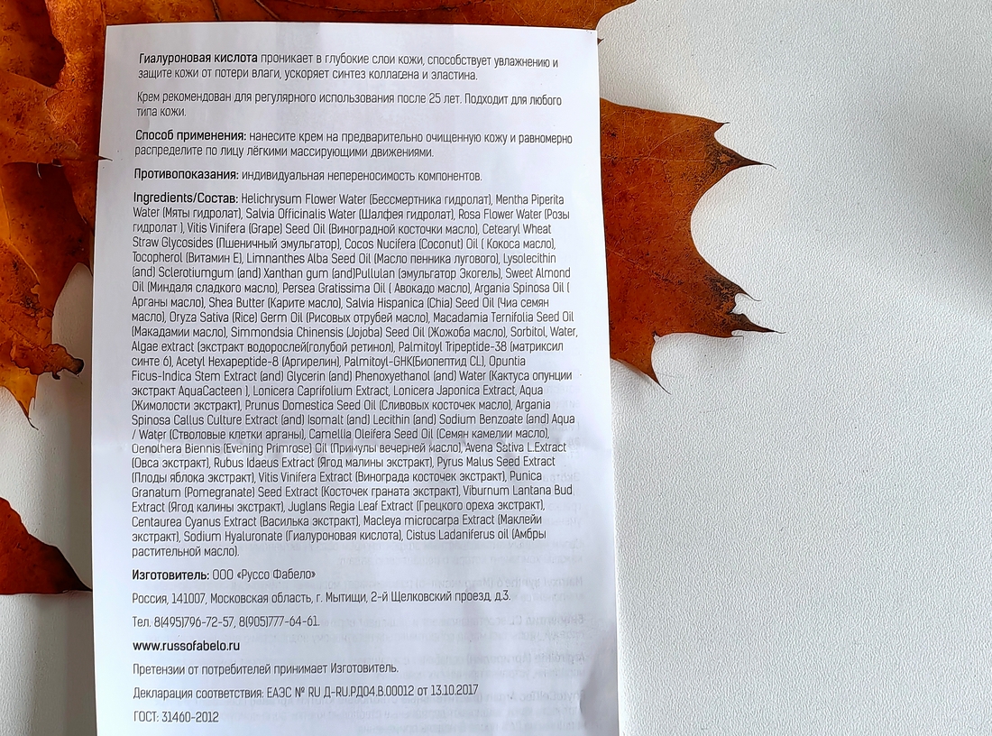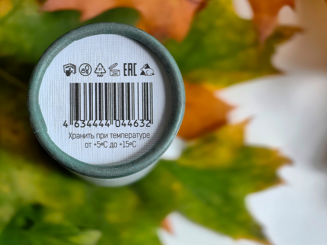 Объём крема — 30 мл, произведён он в России. Из-за предельно натурального состава у крема достаточно жёсткие условия хранения: температура должна быть от +5 до +15 °С. По той же причине срок годности маленький, закрытый крем хранить можно 9 месяцев, а после вскрытия только два месяца. Что ж, такова цена минимального количества консервантов в составе.