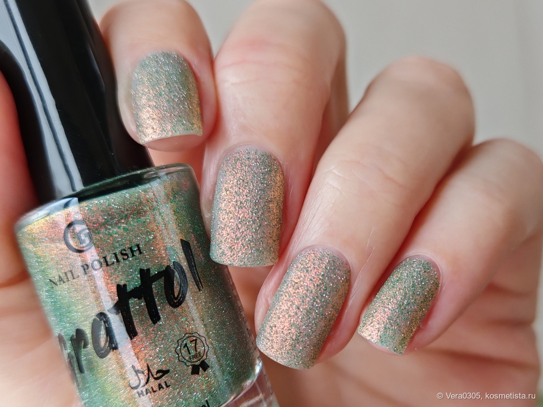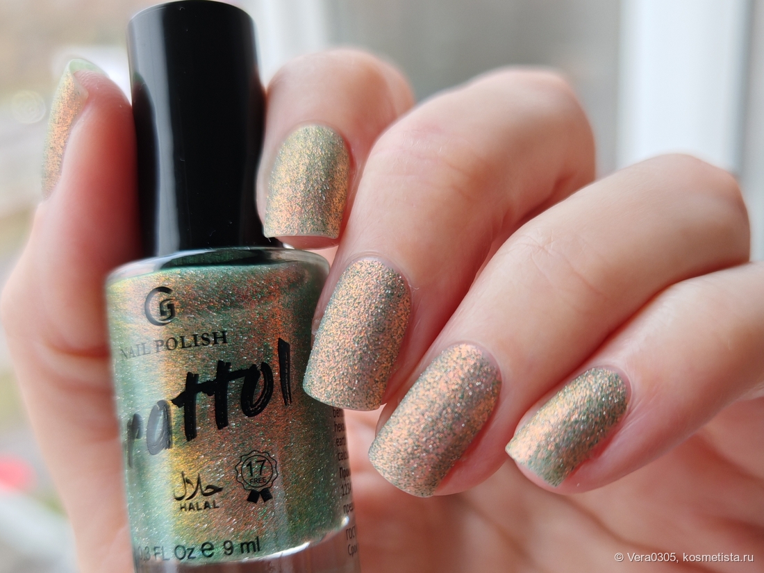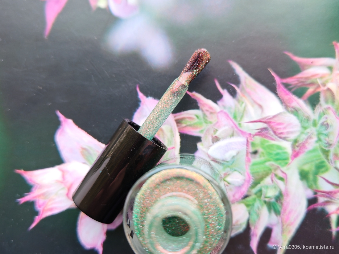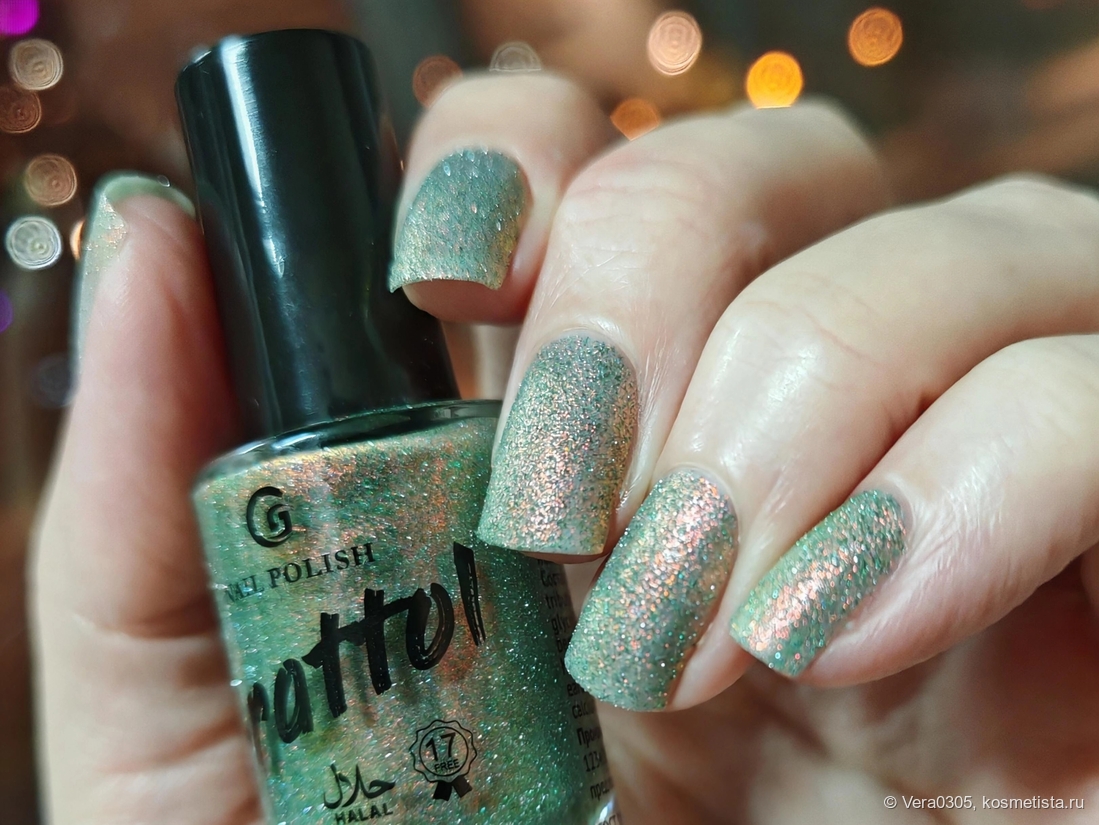 Салатово-зеленый лак с розово-золотистым бликом и светоотражающей крошкой.