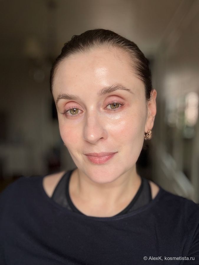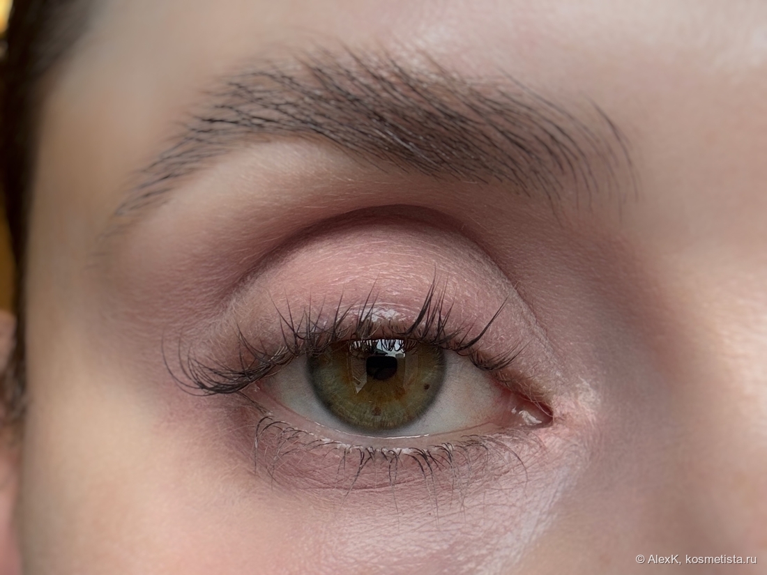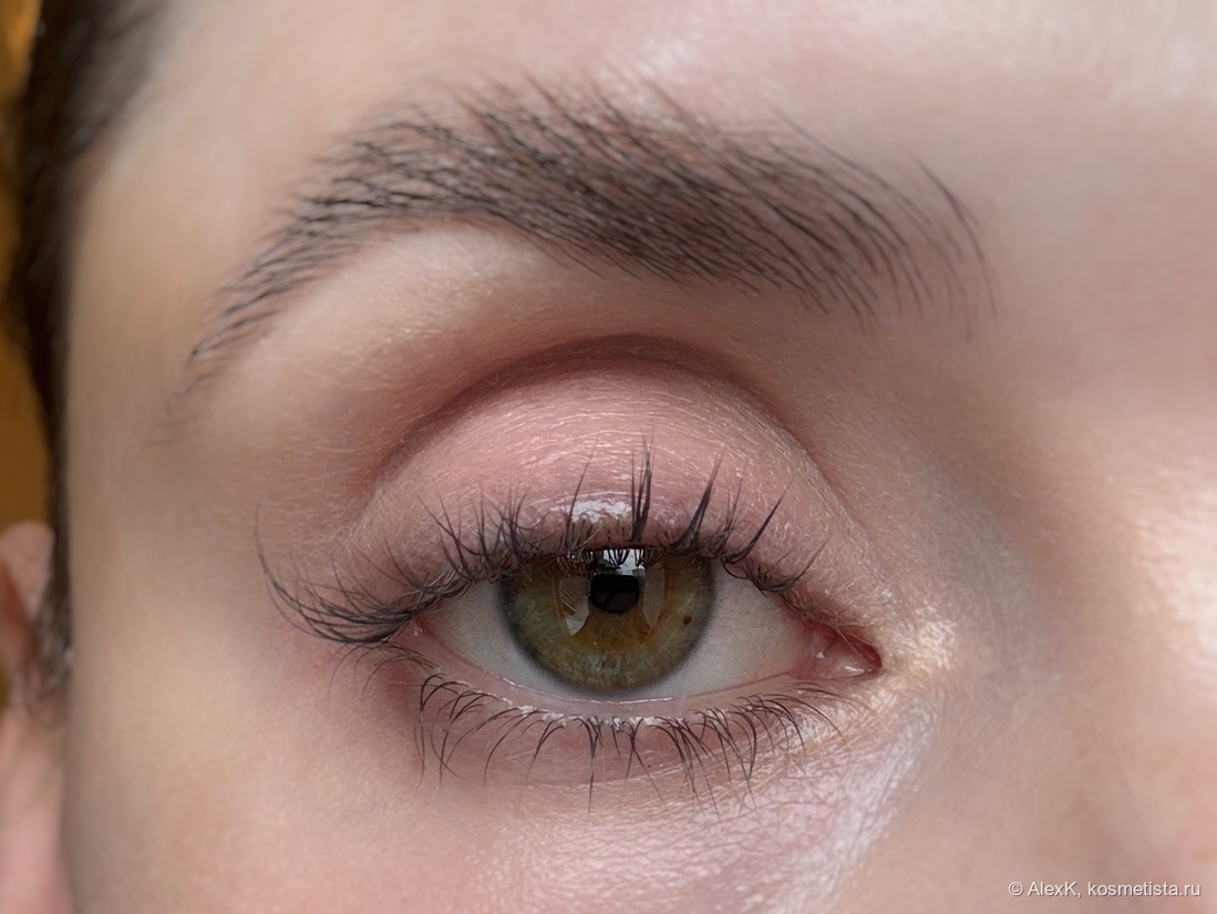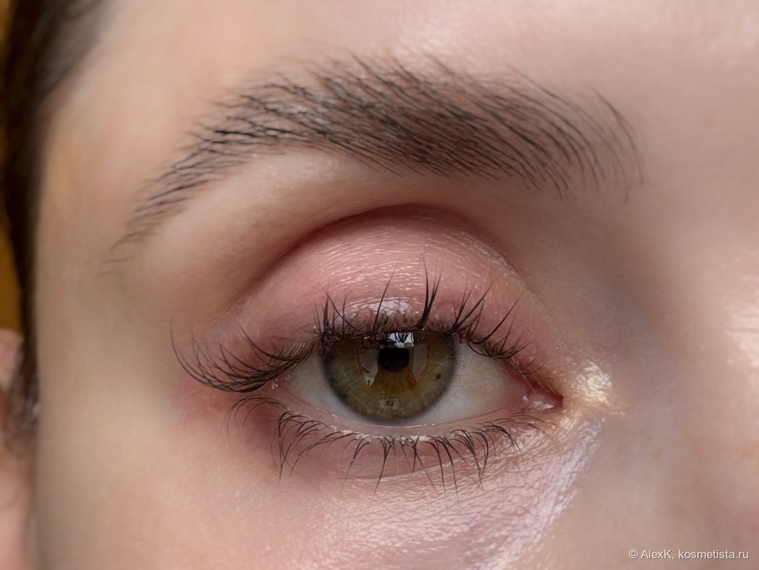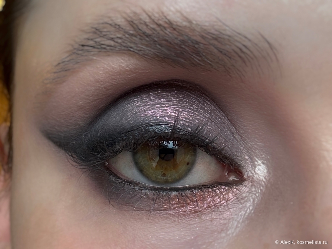 Тут лучше видно блик. Это все магия пигмента Очей услада: в рефиле он кажется теплым персиковым, но на глазах сверкает прохладным розовым. Это полностью меняет дело.