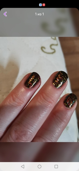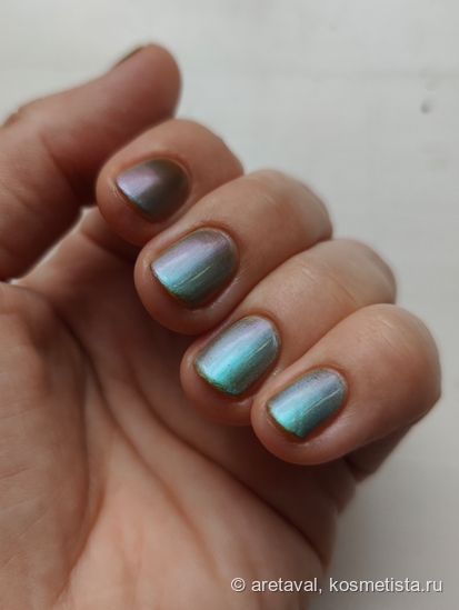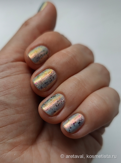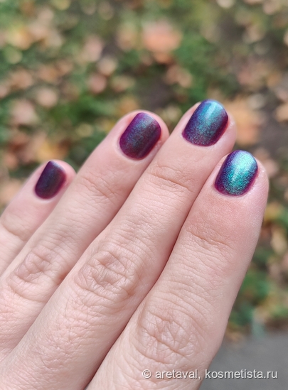 Выглядит лак очень интересно. Оттенок глубокий и многогранный. Слюда яркая, ее видно не только на макро фотографиях, но и в жизни. Легкую шероховатость можно скрыть топом погуще.