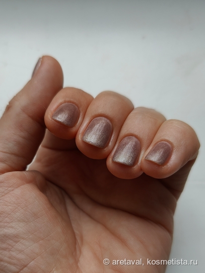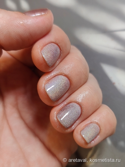 База в один слой кажется довольно прозрачной, но при наслаивании она приобретает насыщенный серый оттенок. Как во флаконе. Но и слюды становится также много. Из-за этого покрытие может быть немного неровным.