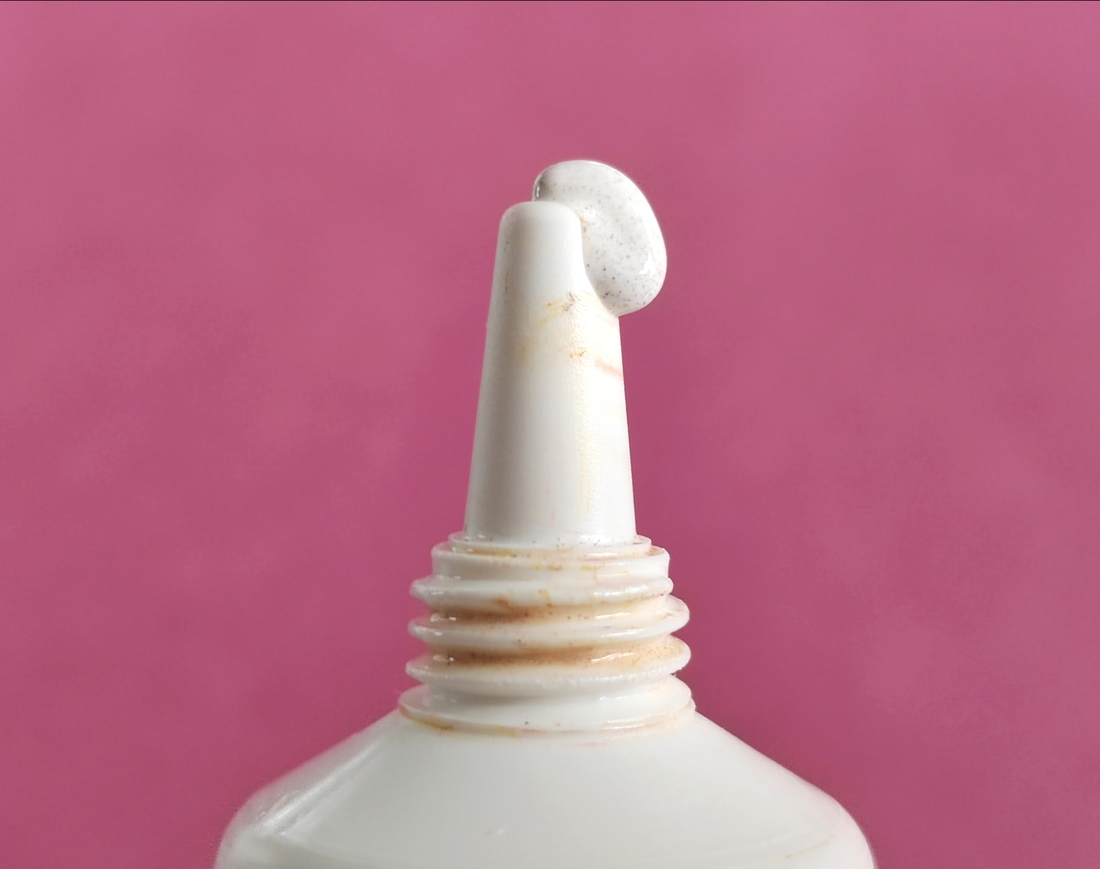 Сам крем изначально имеет белый цвет, который при контакте с кожей начинает трансформироваться в тёплый бежевый.