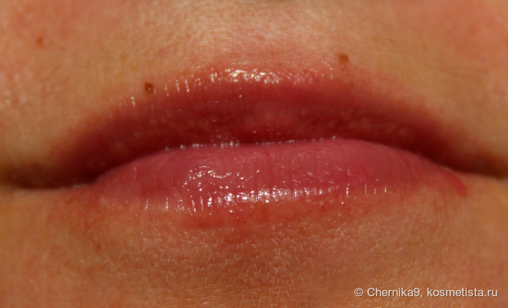 Бальзам делает губы более объёмными, но не пухлыми и не выпуклыми. Яркого блеска тоже у него не найти. Кроме того, из-за особенностей цвета и текстуры он размывает контур губ, из-за чего кажется немного размазанным.