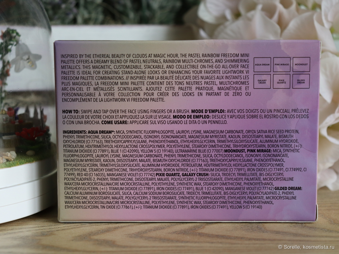 Общий вес теней — 7,2 г (по 1,2 г на рефил). Срок годности после вскрытия — 12 месяцев. Сделано в Китае.