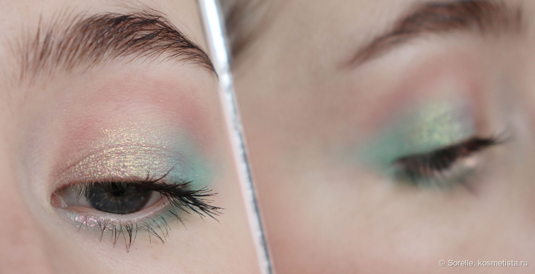 Aqua Dream — красивый бирюзовый оттенок, в меру яркий и в меру пастельный. Я думала, что он будет более меловым, но нет — отличный, даже стрелку им можно нарисовать! И очень простой в использовании, хотя в кожу я все-таки предпочитаю его уводить через другие оттенки. Единственное — при плотной набивке может чуть тинтовать кожу, но при двухступенчатом очищении все смывается.