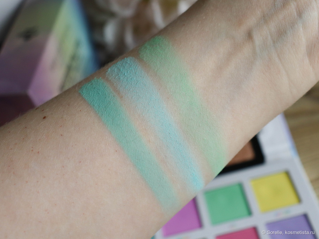 Матовые оттенки пигментированные, отлично растушёвываются и наслаиваются, немного пылят при наборе кистями.