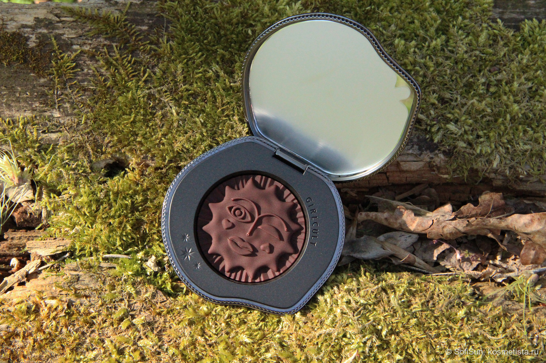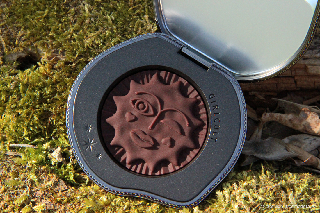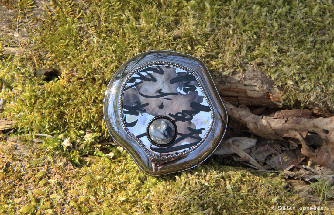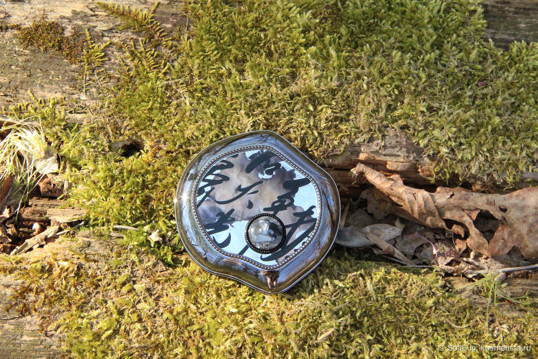 Футляр тоже впечатляет. Металлический, серебристо-серый, с большим переливающимся камнем сверху. Внутри хорошее зеркало, всё собрано идеально: никаких швов, подтёков, кривых наклеек. За упаковку я ставлю самый высокий балл. Честно, я могла бы бесконечно вертеть эту пудреницу в руках и разглядывать иероглифы. Разрушать это милое подмигивающее солнышко было жалко, но хотя бы остались красивые фотографии.