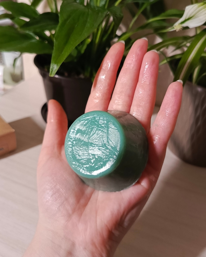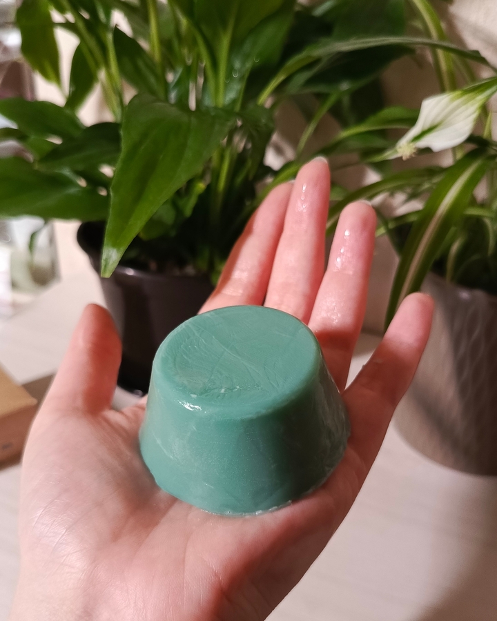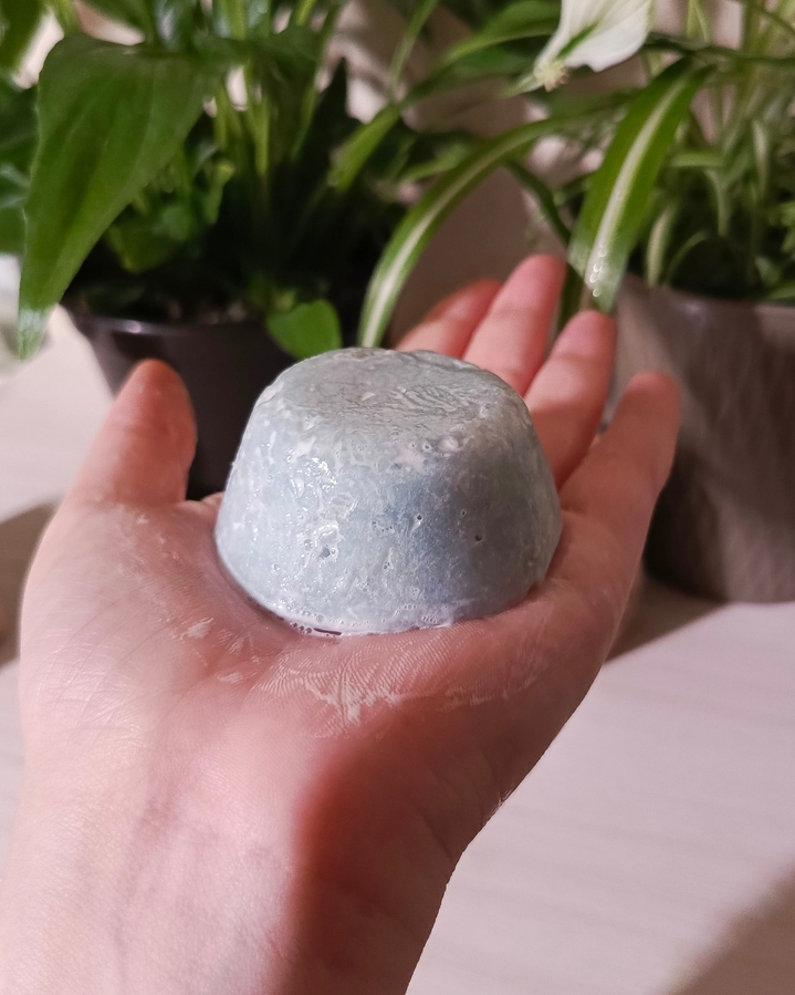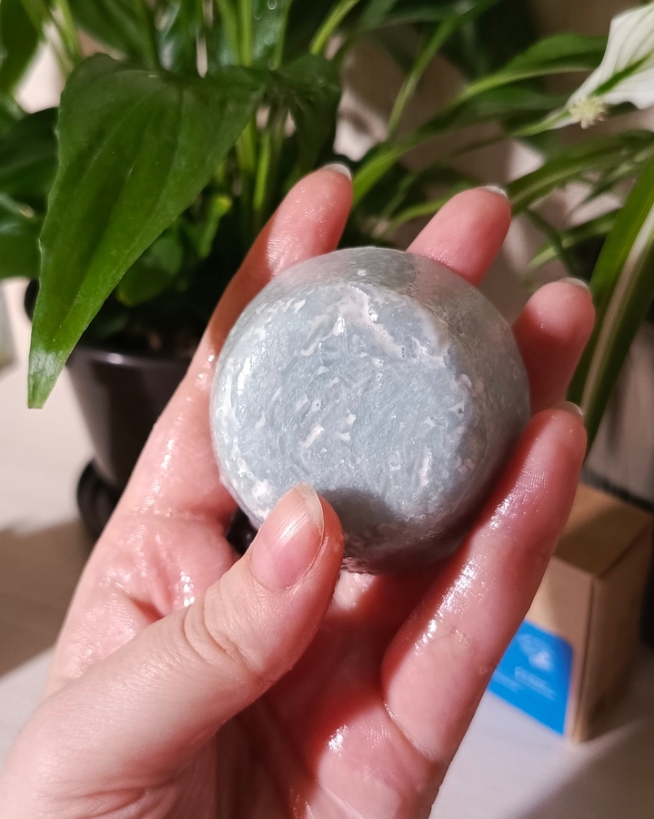 - С кондиционером ситуация несколько сложнее. Его нанесение требует определённой сноровки, как и большинство твёрдых аналогов. Продукт плохо собирается на руку, поэтому его эффективнее распределять прямо по длине волос. Не могу сказать, что это очень сложно, но времени занимает гораздо больше, чем нанесение шампуня или обычного кондиционера.