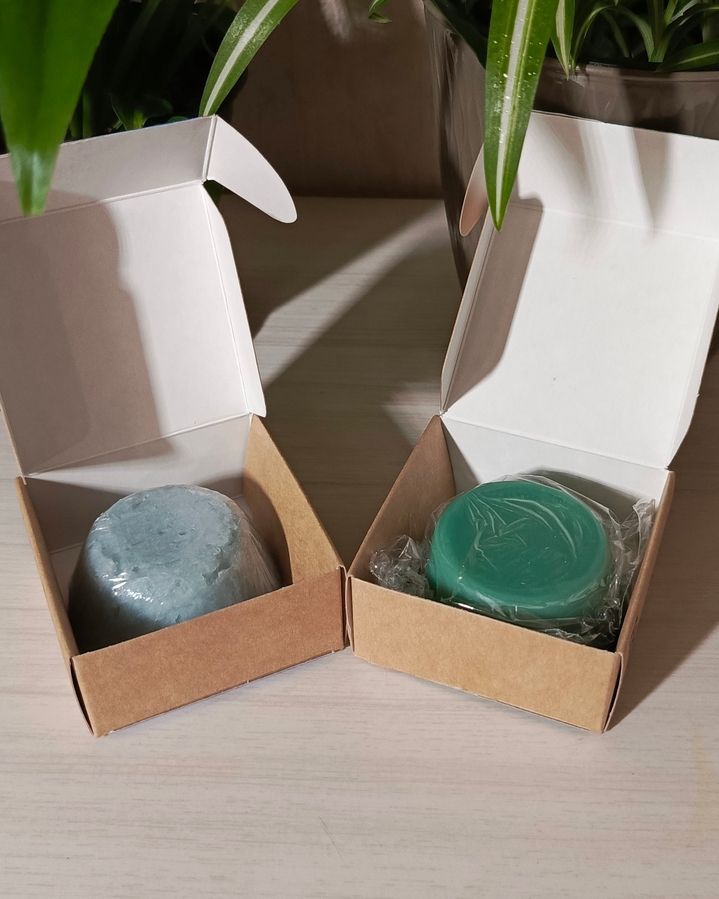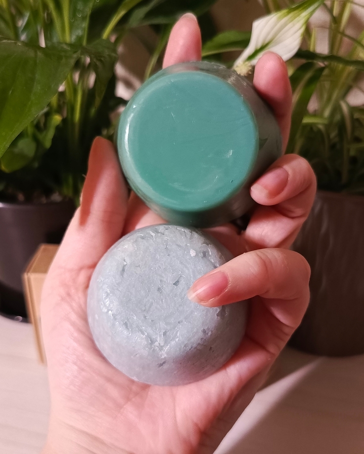 Внутри каждый брусочек дополнительно завернут в плёнку. Внешнее различие между средствами сразу бросается в глаза и практично исключает путаницу в процессе использования. Шампунь имеет зернистую структуру и нежно-голубой оттенок, в то время как бальзам абсолютно гладкий и окрашен в спокойный зелёный цвет.